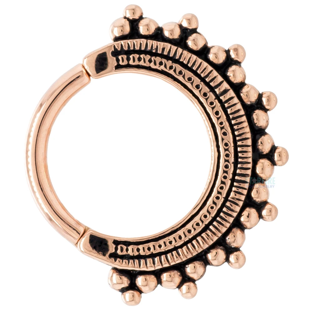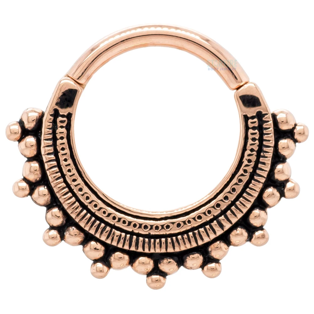 With a millgrain plate and a row of tiny tri bead accents, what’s not to love about this “Afghan” hinge ring? It features an antique finish for that distressed look.