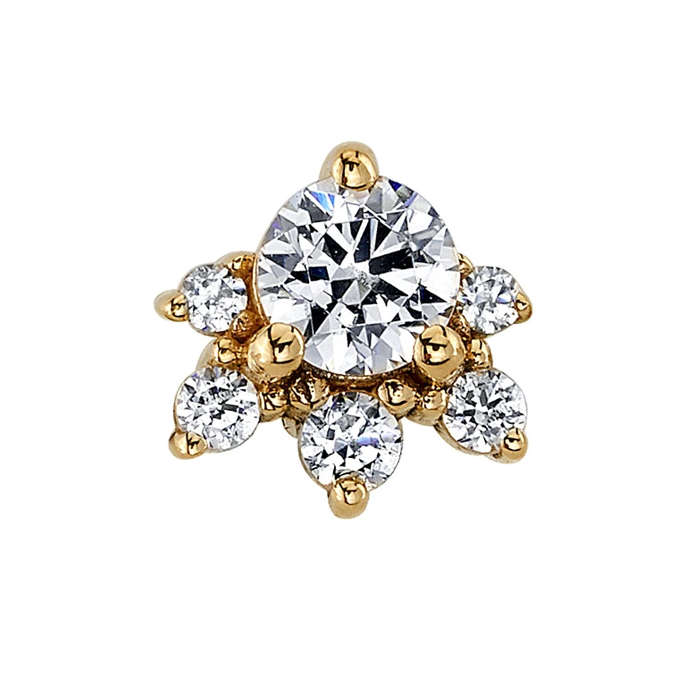 - 5.5mm x 6mm threaded end with (1) 3mm Round Genuine White Diamond accented by (2) 1mm / (2) 1.25mm / (1) 1.5mm Genuine White Diamonds in Prong’s