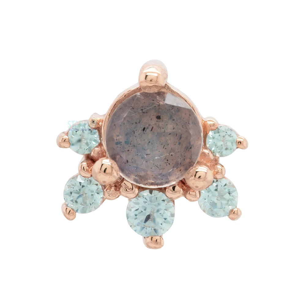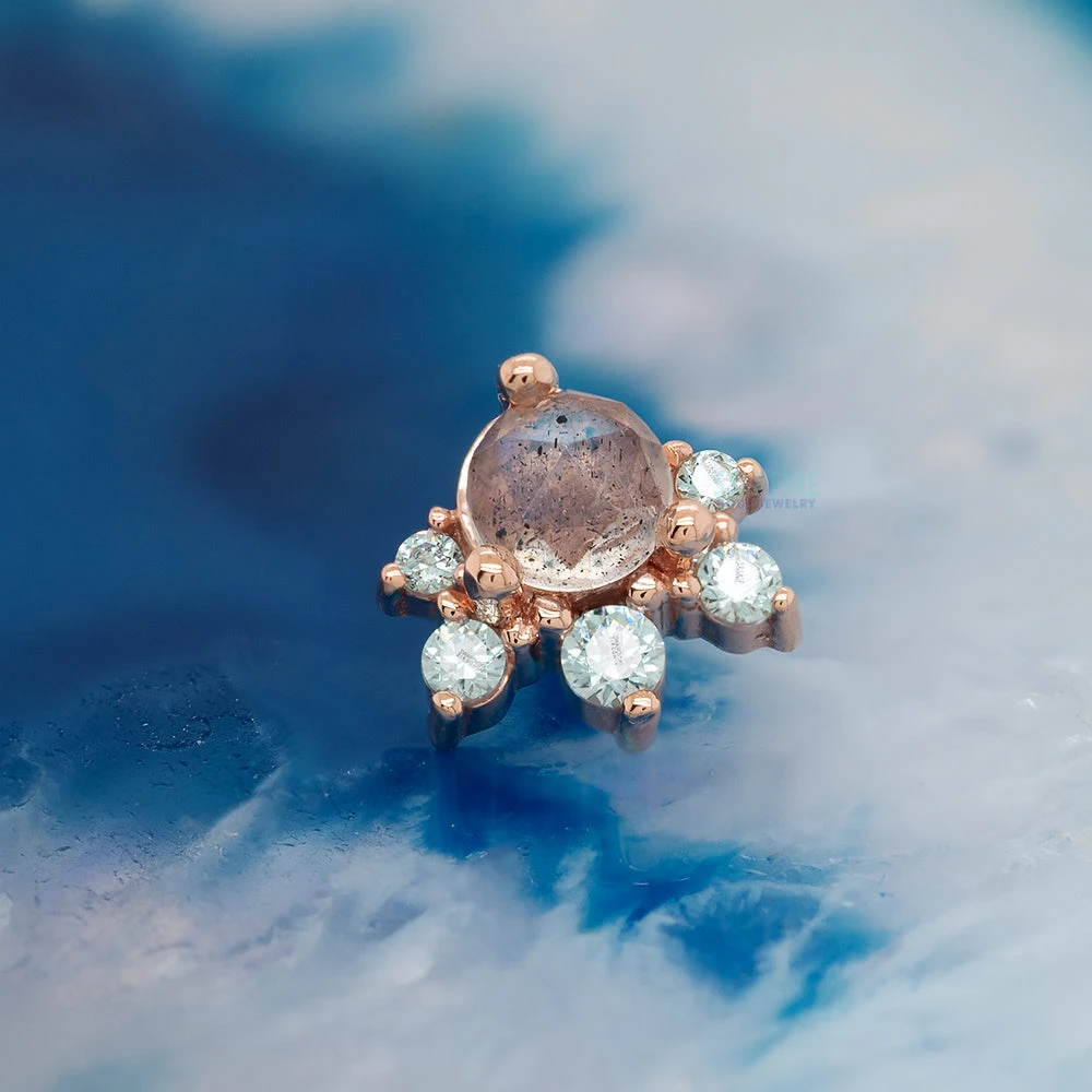 - 5.5mm x 6mm threaded end with (1) 3mm Rose Cut Labradorite accented by 1mm / 1.25mm / 1.5mm / 1.25mm / 1mm Round Cyan CZ’s in Prong’s