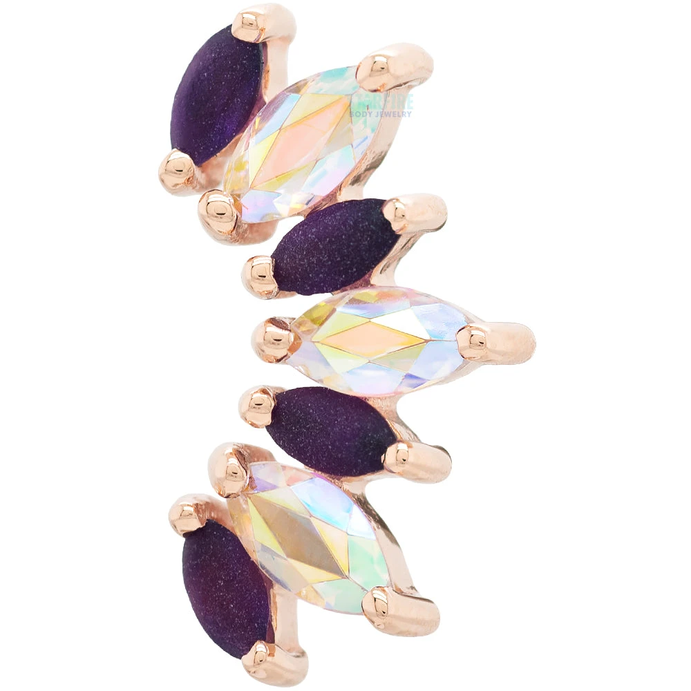 - Tiny: 10mm x 5.3mm threaded end with alternating (4) 2.5mm x 1.25mm Marquise-Cut Genuine Sandblasted Amethyst AA & (3) 3mm x 1.5mm Marquise-Cut Mercury Mist Topaz in Prong’s