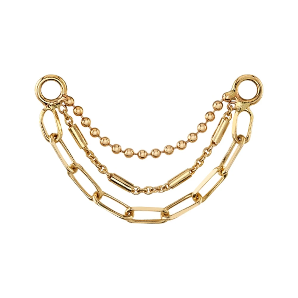 Add flair to your jewelry with this “Aylin” chain attachment! Whether you choose to attach this chain from different jewelry or choose to attach it from the front and back of one piercing, the possibilities are endless. This piece features a combination of beads, Ophelia, and Capulet chains that graduate.
