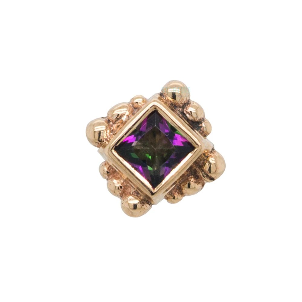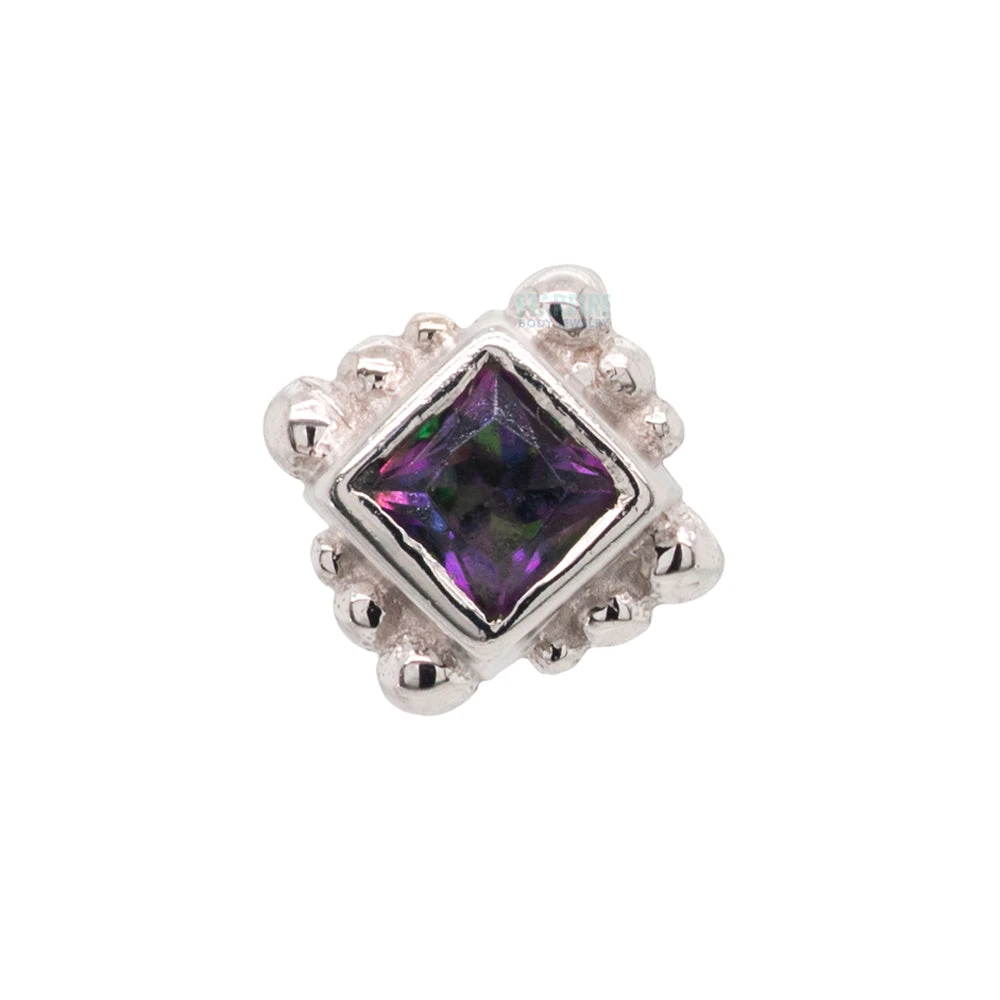 - 2mm Princess Cut Mystic Topaz in Bezel surrounded by tiny graduating bead accents threaded end