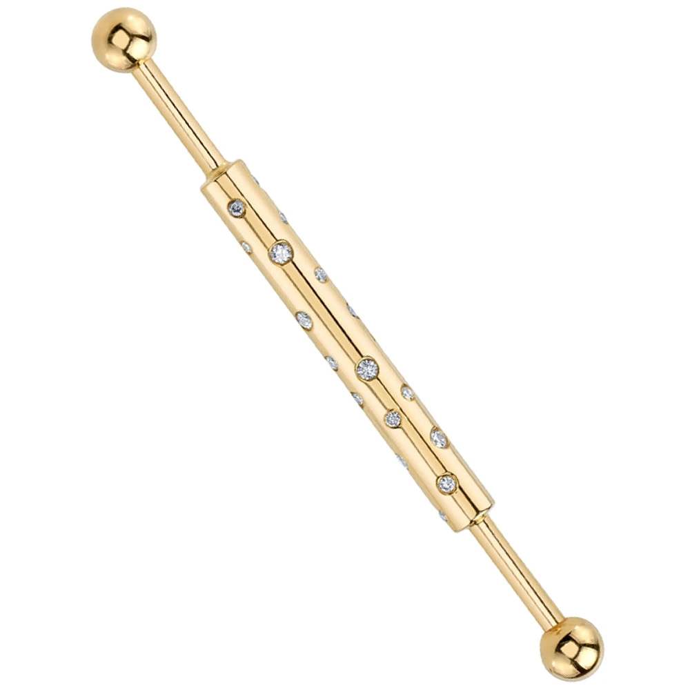 Introducing “Celestial” – a masterfully crafted industrial barbell, adorned with dazzling diamonds that resemble the twinkling stars in the night sky.