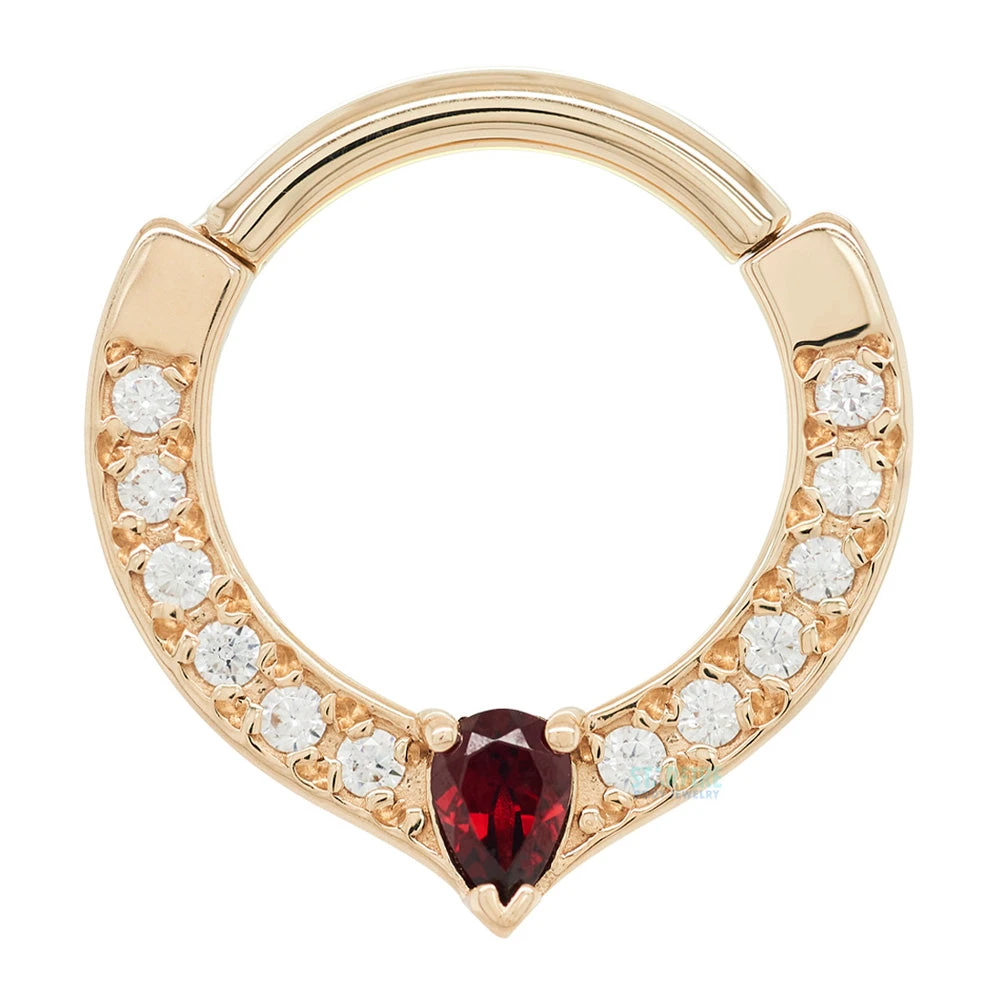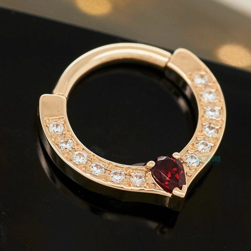 Experience pure bliss with our this hinge ring. The dazzling pear shaped Garnet is the center of attention, as you cherish its sparkling beauty.