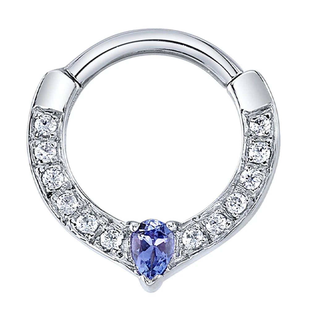 Experience pure bliss with our this hinge ring. The dazzling pear shaped Tanzanite is the center of attention, as you cherish its sparkling beauty.