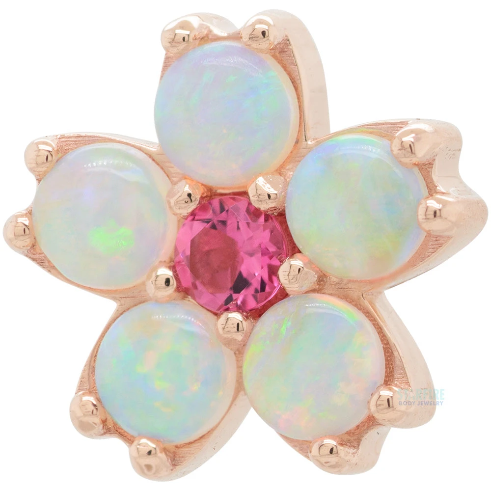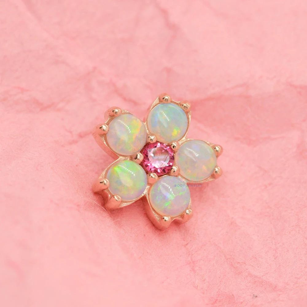 - 6mm threaded end with (5) 1.5mm Round Genuine White Opals (petals) surrounding (1) 2mm Round Genuine Pink Tourmaline (center) in Prong’s