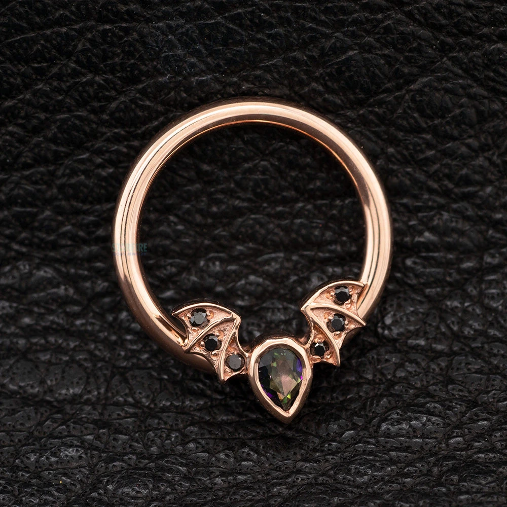 - 9mm x 6mm bat fixed on horizontal captive bar with (1) 3mm x 2mm Pear-Cut Mystic Topaz in Bezel & (6) 0.8mm Round Black Diamonds on Wings in Prongs