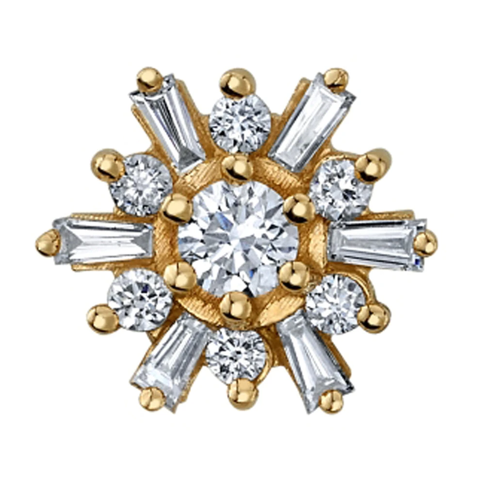 - 8mm threaded end with (6) 2mm x 1.3mm x 1mm White CZ Tapered Baguettes & (6) 1.25mm Round White CZ’s surrounding (1) 2.5mm Round White CZ in Prong’s