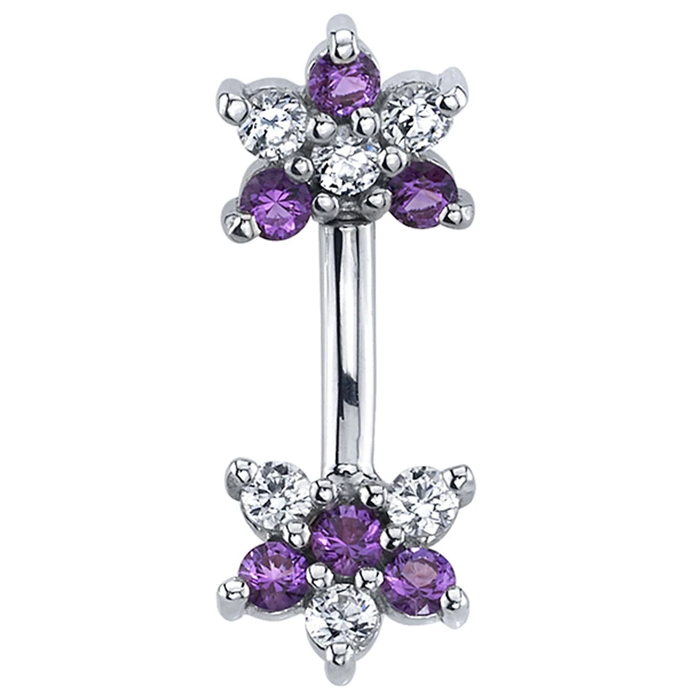 Get ready for your rook to bloom with this curved barbell! This gorgeous piece features not one, but two sparkling flower designs, adorned with alternating Amethyst & White CZ’s.
