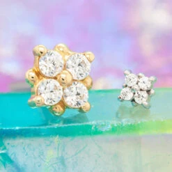 - 5mm Flower #2 fixed bottom with alternating (3) 1.5mm Round Amethyst AA & (3) 1.5mm Round White CZ’s in Prong’s & (1) 5mm Flower #2 threaded top with alternating (3) 1.5mm Round White CZ’s & (3) 1.5mm Round Amethyst AA in Prong’s
