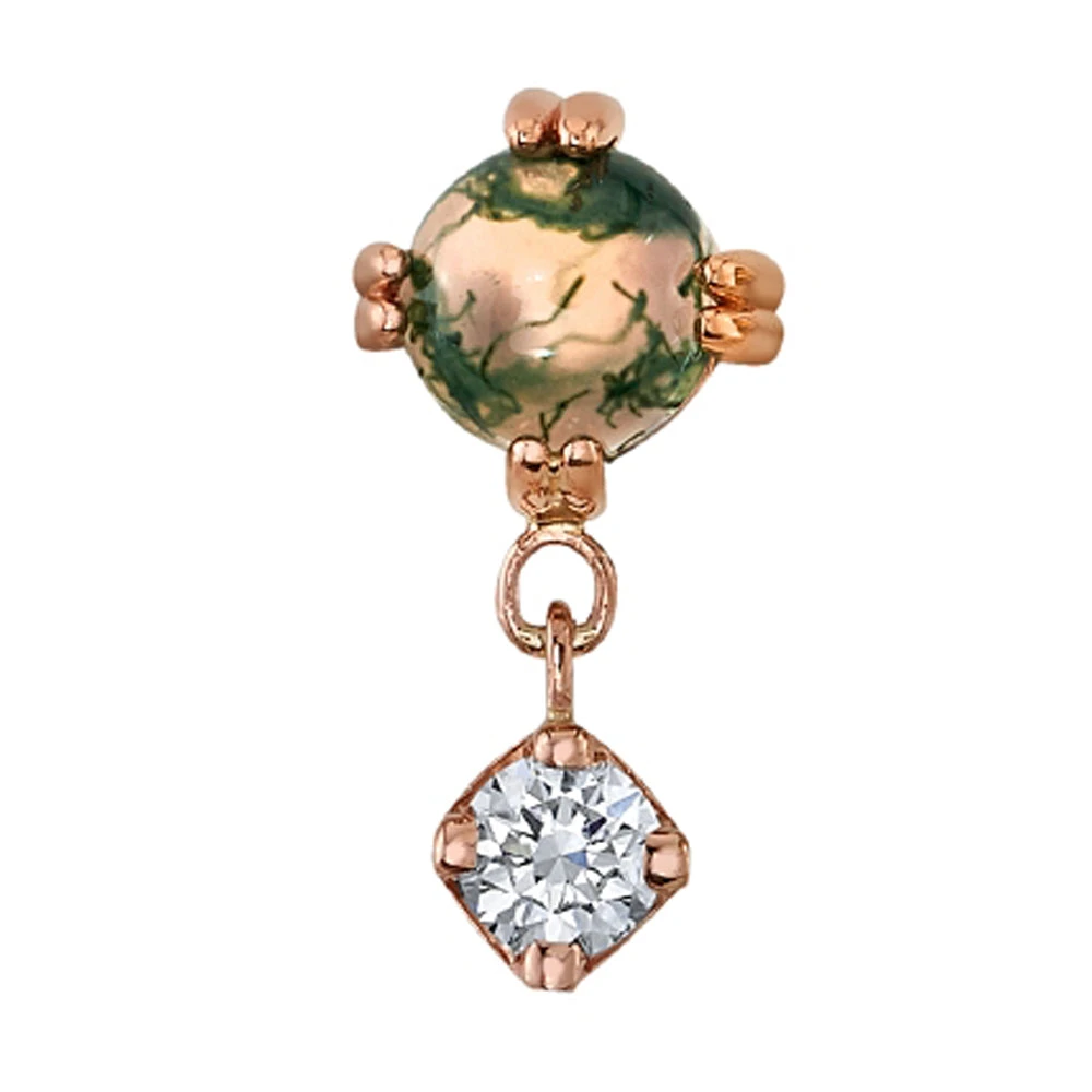 - threaded end with (1) 3mm Round Moss Agate Cabochon in Prong’s & a dangle with (1) 2mm Round White Sapphire AA DC in Prong’s