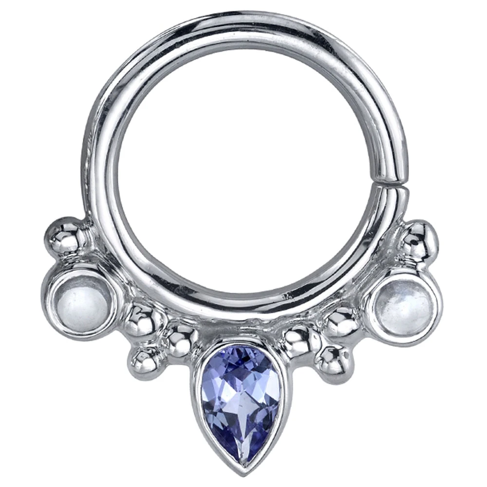 - (2) 2mm Round Rainbow Moonstone Cabochons in Bezels with (1) 4mm x 2.5mm Pear Tanzanite in bezel (center) & tri bead accents in between bezels