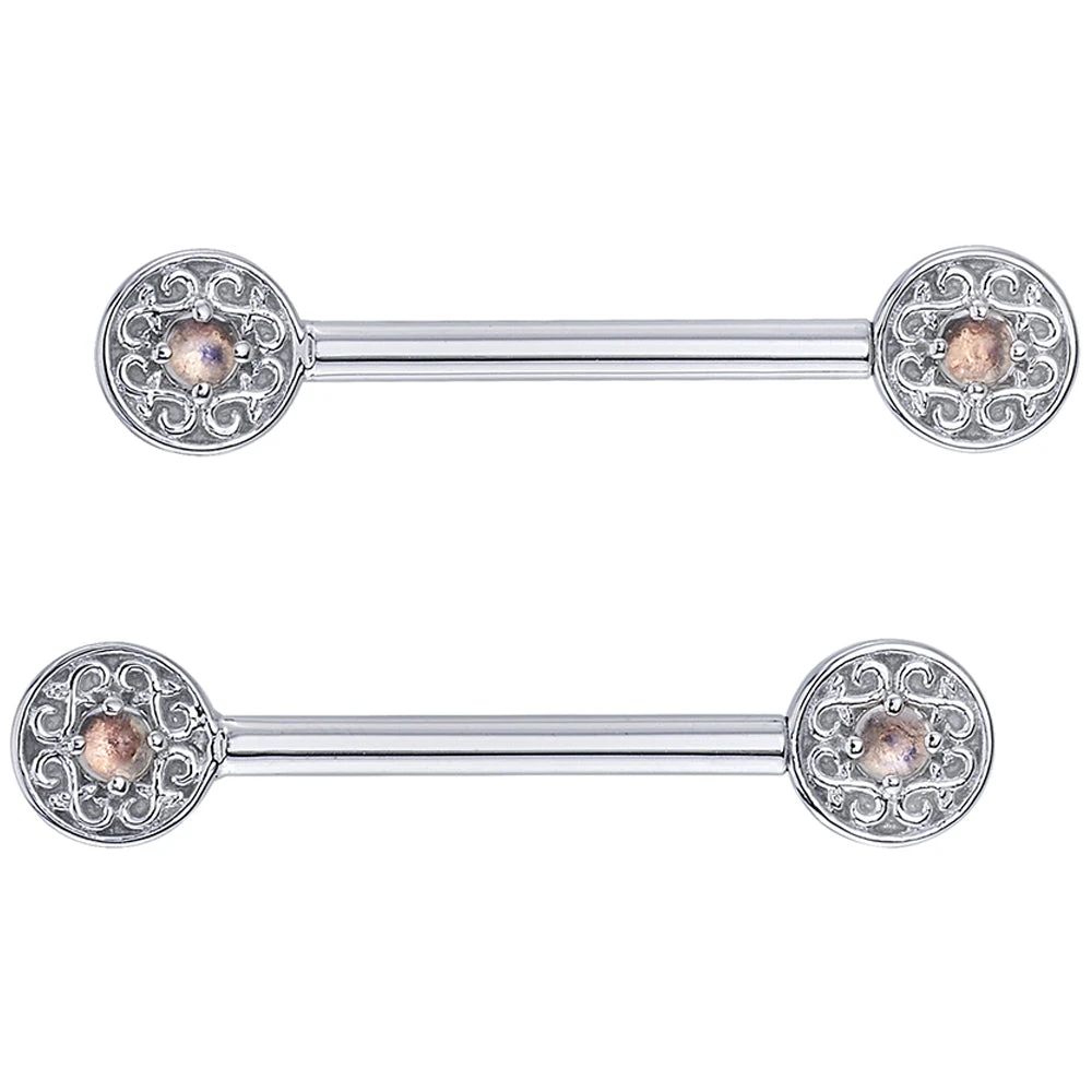 Give your nipple jewelry the ultimate upgrade with the “Elizabeth”, featuring a gold filigree design that effortlessly frames the center Rainbow Moonstone gem