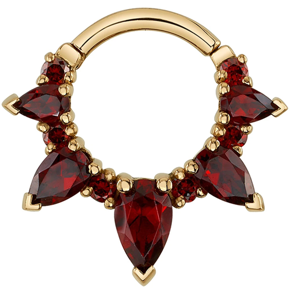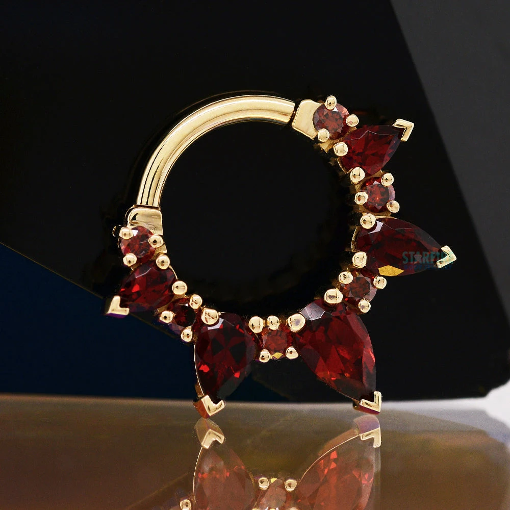 Experience the rise of the Empress with this exquisite “Empress Rising” Hinge Ring! This ring features a combo of Garnet Pears and Round Red Diamonds that will take your breath away. A beauty fit for a Queen or King!