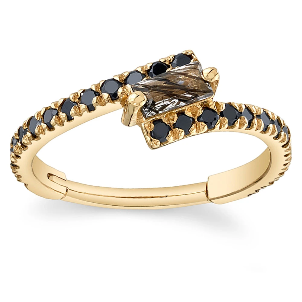- (1) 4mm x 2mm Baguette Cut Tourmalinated Quartz in center with (26) 1.25mm Round Black Diamonds in Prong’s