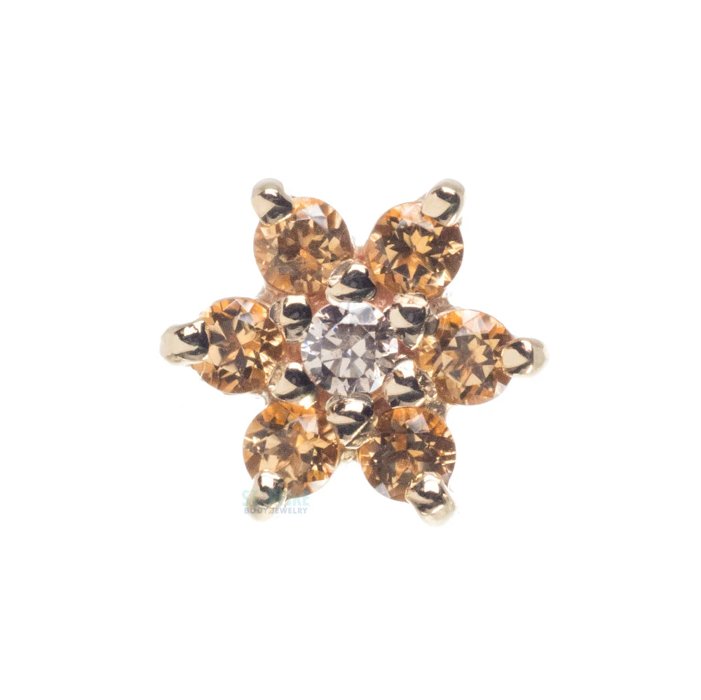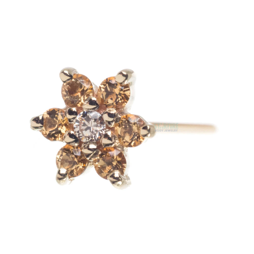 - 5mm flower with (6) 1.5mm Round Honey Topaz in Prong’s (petals) & (1) 1.5mm Round Champagne CZ in Prong’s (center)