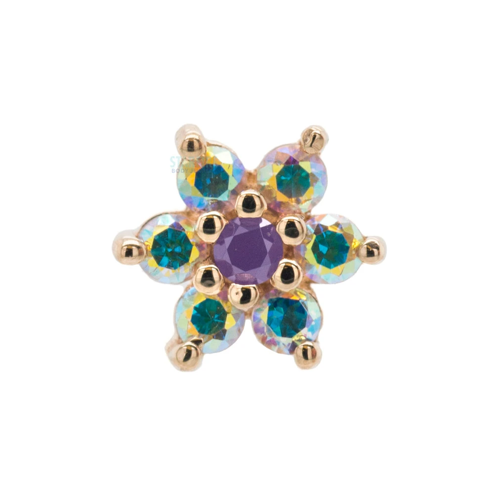 - 5mm flower with (6) 1.5mm Round Mercury Mist Topaz in Prong’s (petals) & (1) 1.5mm Round Opaque Purple CZ in Prong’s (center)