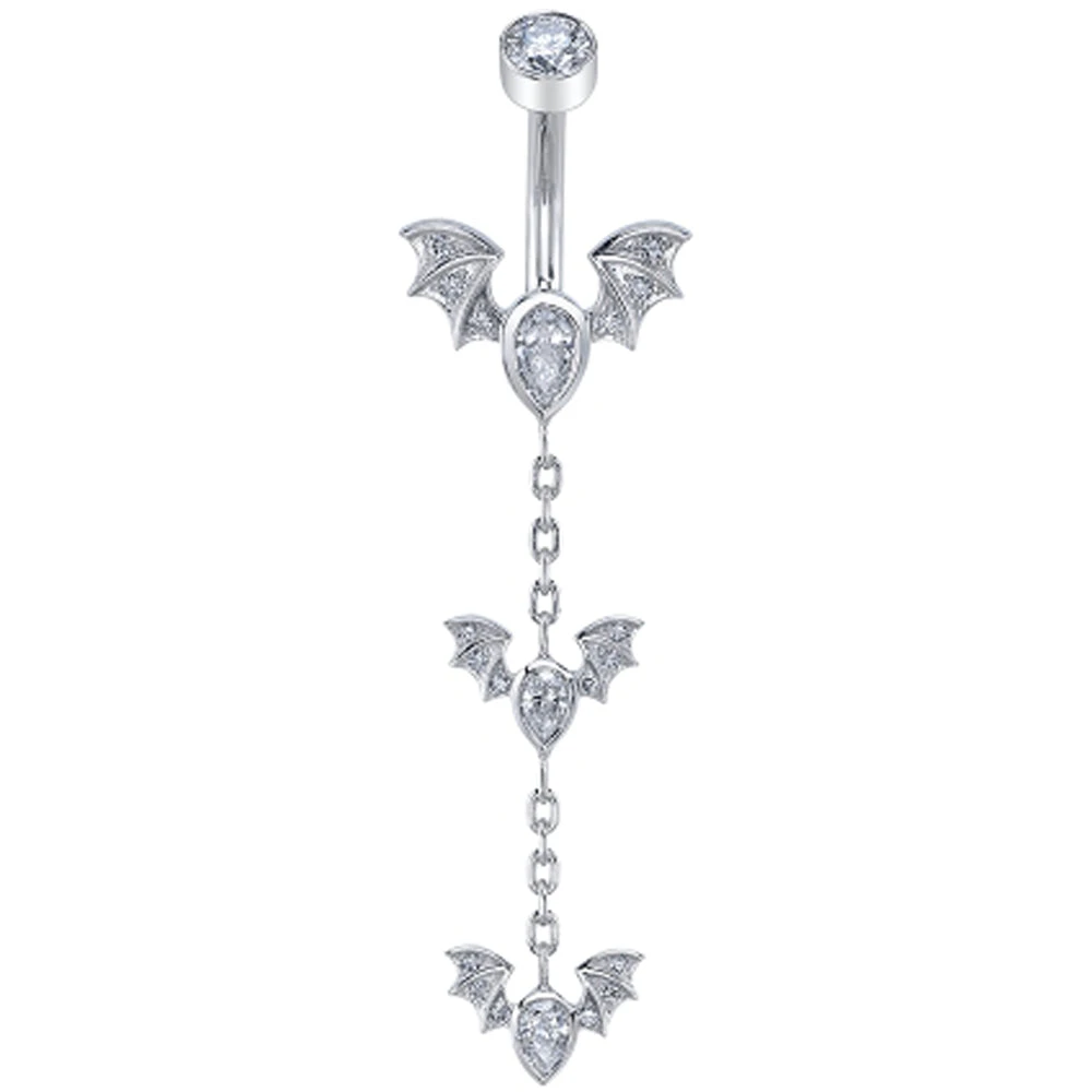 Take flight and unleash your inner countess! This navel curve features shimmering diamond bats with outstretched wings dangling on a chain.