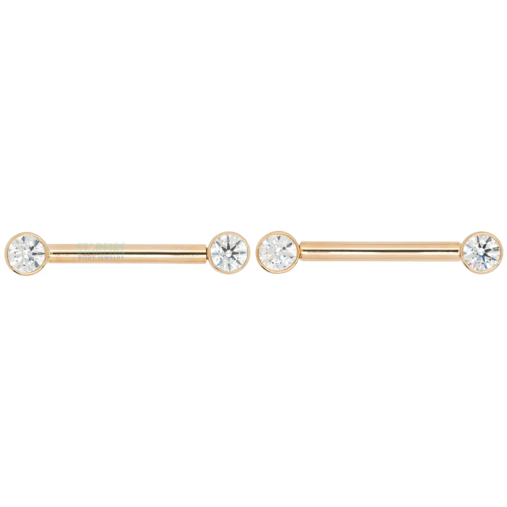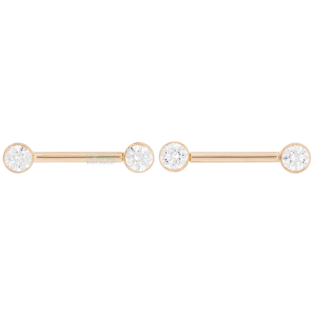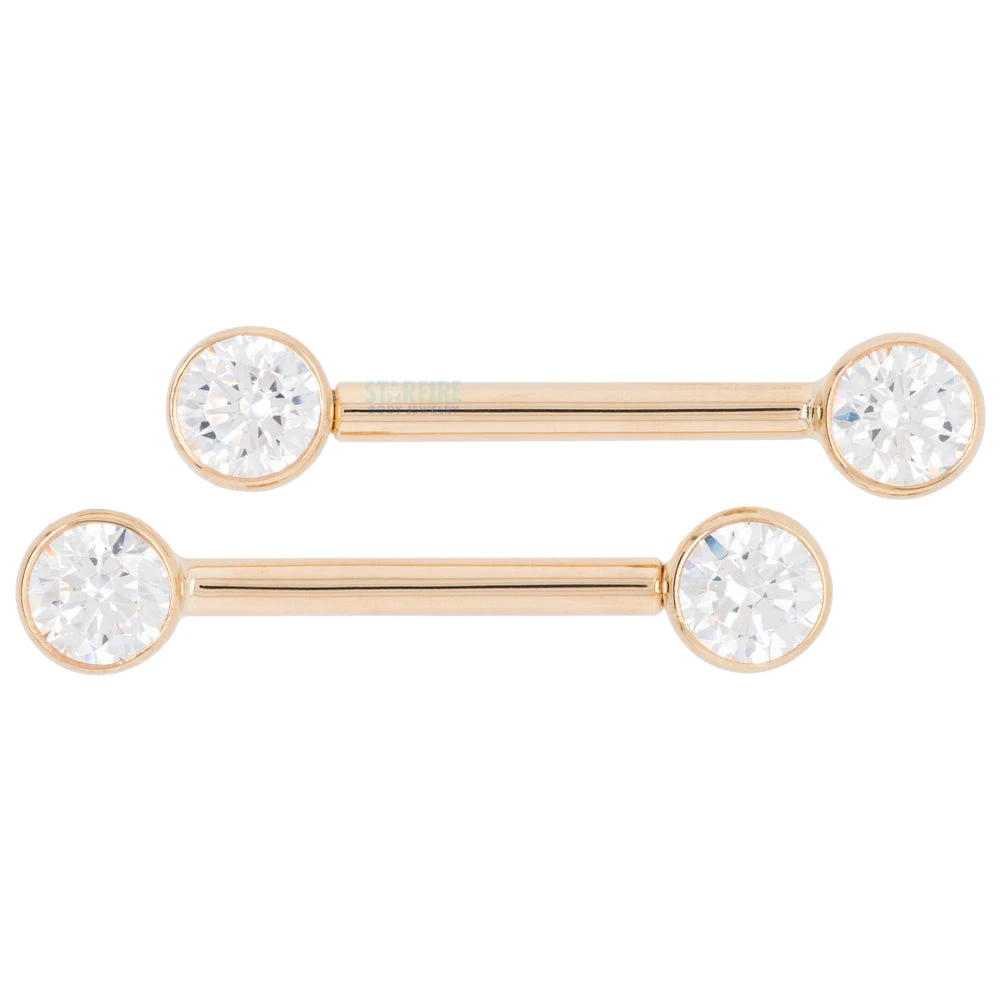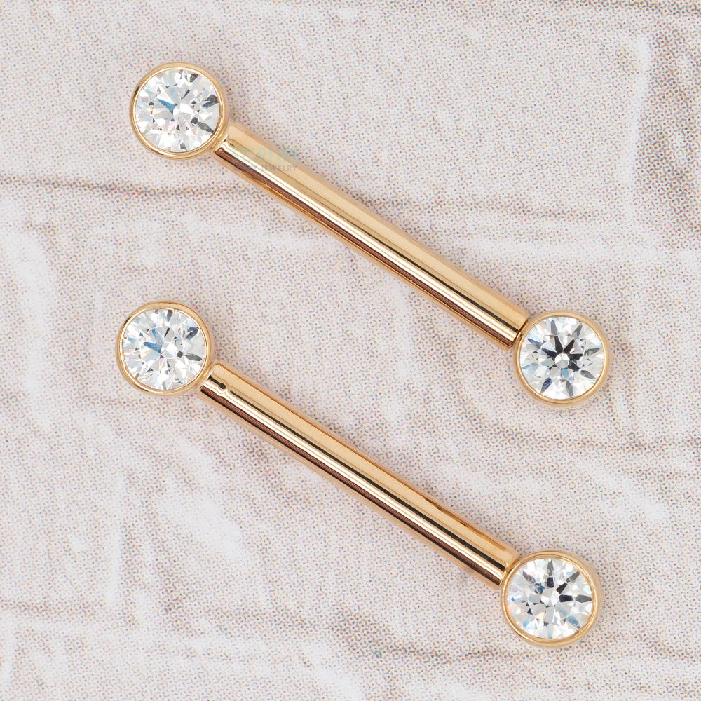 Gems wrapped in gold that are side set so you can truly appreciate your forward facing straight barbell bling! This bezel bell will showcase brilliantly.