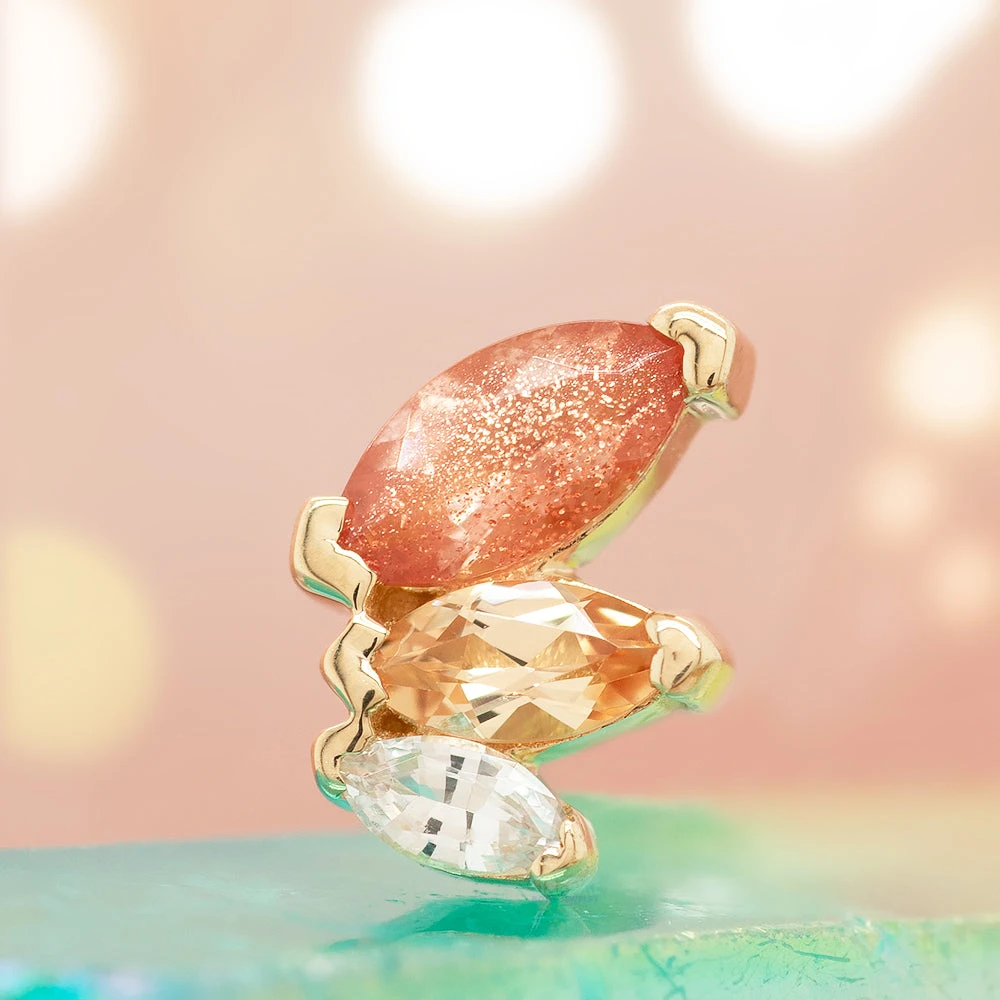 - 7mm x 6mm threaded end with (1) 5mm x 2.5mm Marquise-Cut Oregon Sunstone, (1) 4mm x 2mm Marquise-Cut Champagne Sapphire & (1) 3mm x 1.5mm Marquise-Cut White Sapphire Faceted Gems in Prong’s