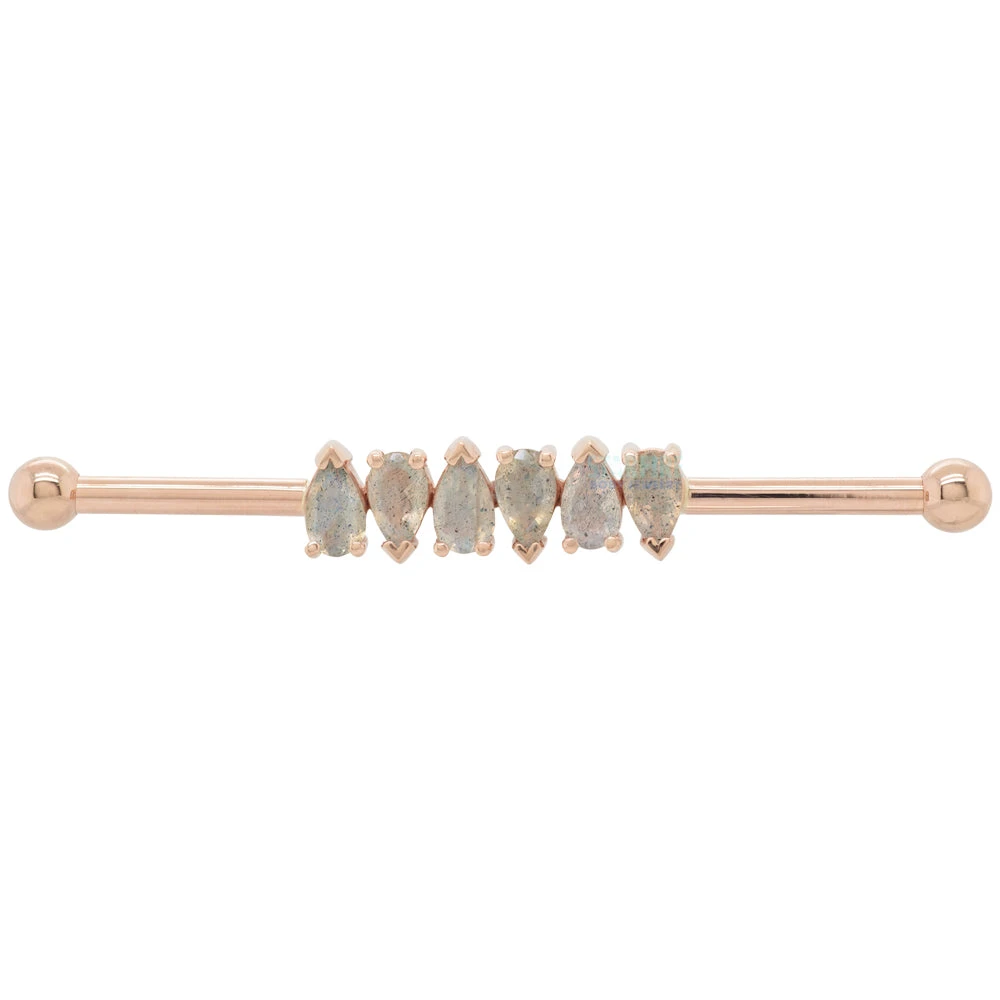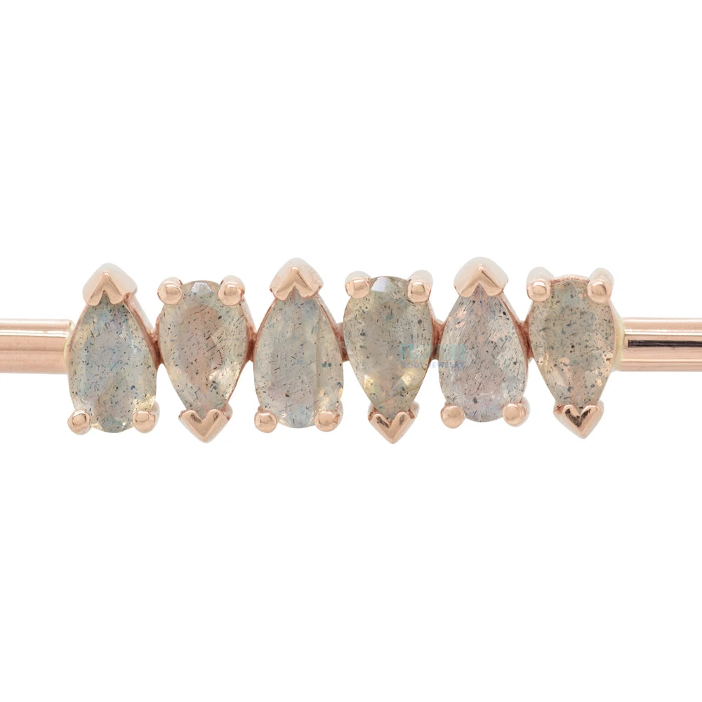 - (6) 4mm x 2.5mm Faceted Labradorite Pears on top of barbell with (2) 1/8″ bead threaded ends