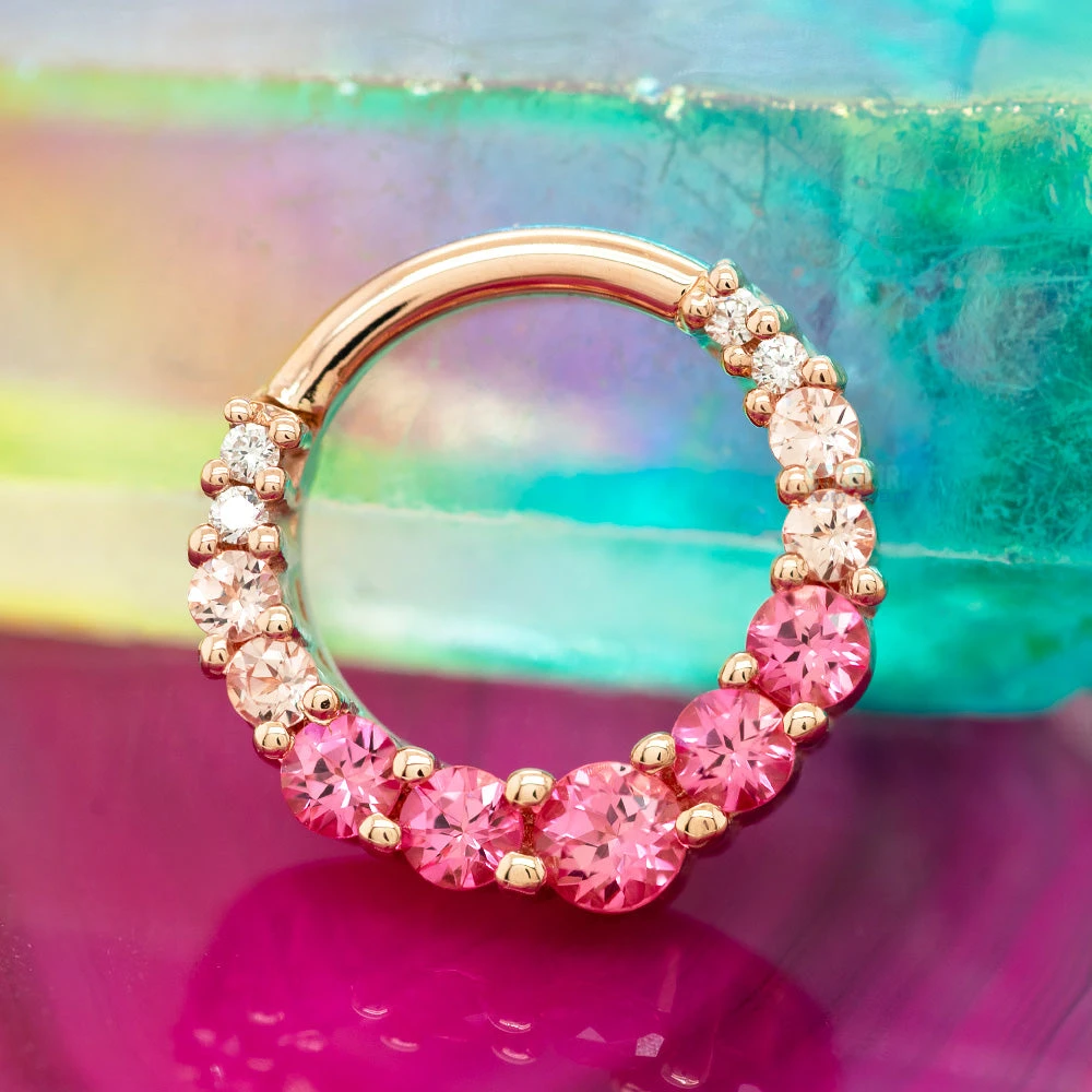 This exquisite hinge ring is a luxurious must-have. The graduating gems, include stunning Padparadscha Sapphire, Champagne Sapphire and Diamonds add an air of sophistication and exclusivity.