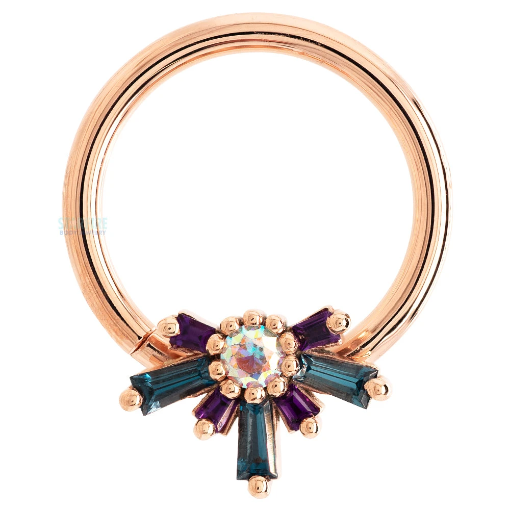 - 8mm fixed design with (4) 1.25 x 1 x .75mm Tapered Amethyst Baguettes and (3) 2.5 x 1.3 x 1mm Tapered London Blue Topaz Baguettes surrounding (1) 2mm Round Mercury Mist Topaz in Prong’s