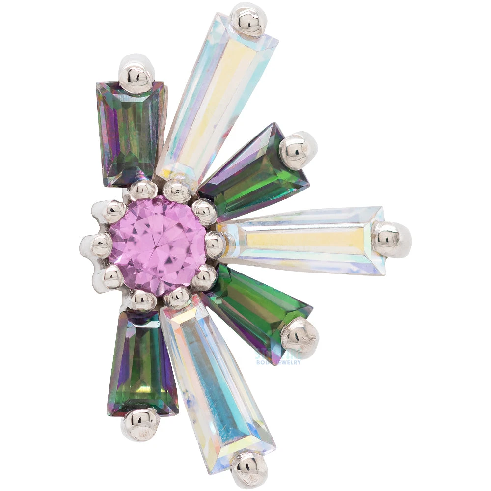 - Supernova: 14mm threaded end with (3) 5mm x 2mm x 1mm Mercury Mist Topaz Tapered Baguettes & (4) 3mm x 2mm x 1mm Mystic Topaz Tapered Baguettes surrounding (1) 3mm Round Pink Sapphire AA in Prongs