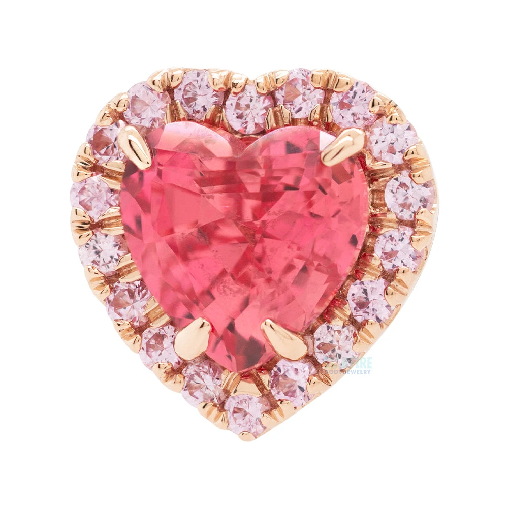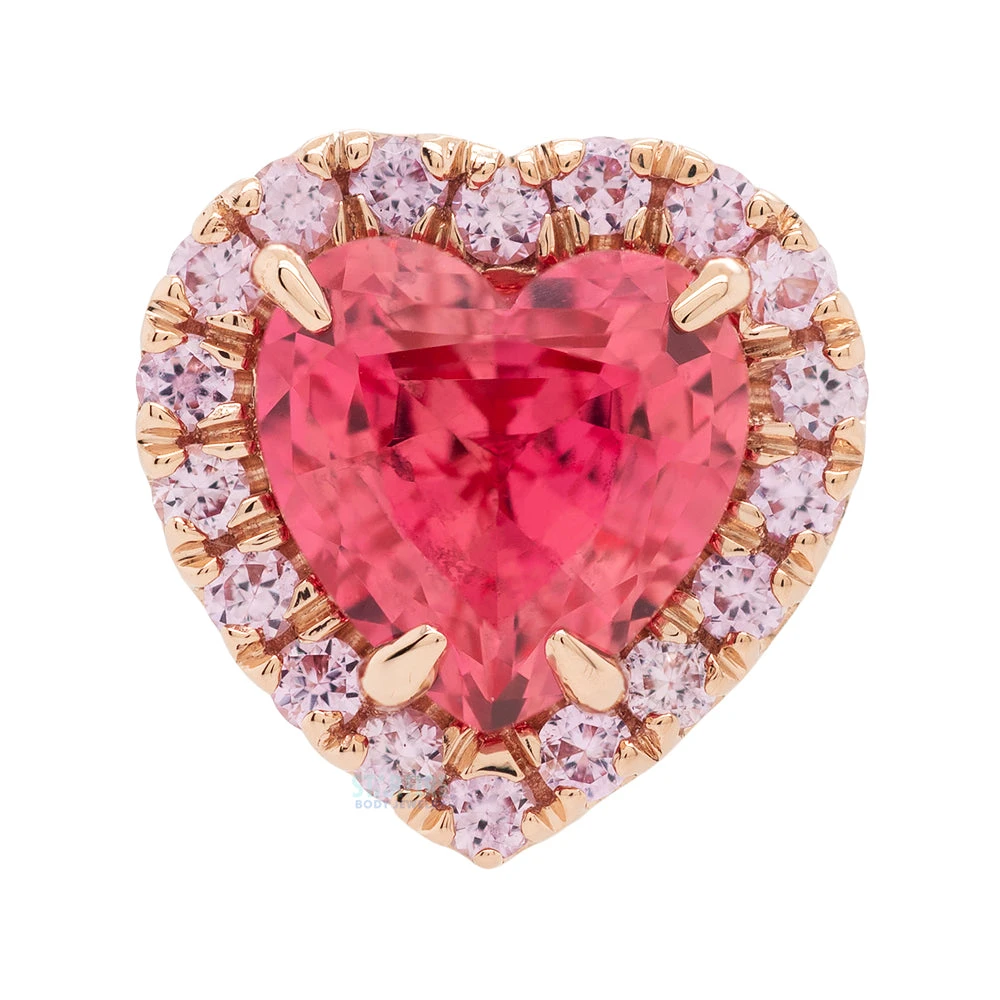- 7.3mm threaded end with (1) 5mm Heart Padparadscha Sapphire in Prongs surrounded by (18) 1mm Round Light Pink Sapphires in Prongs