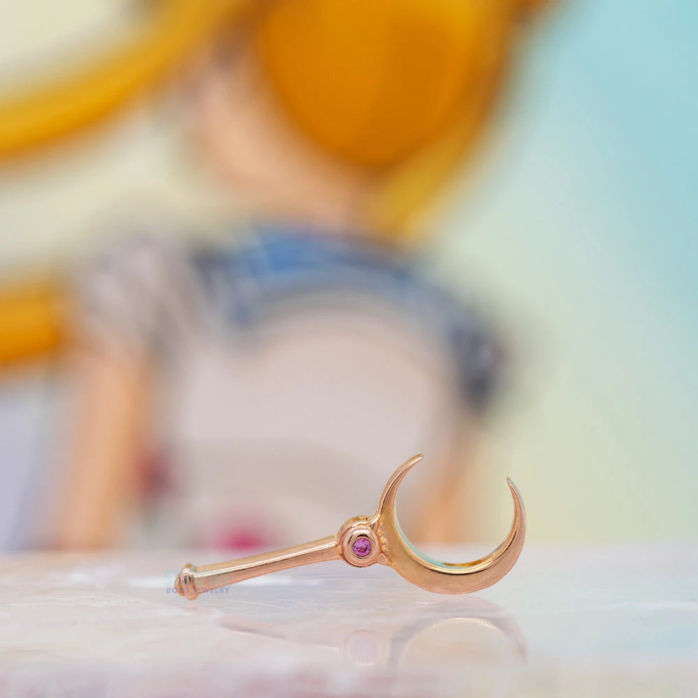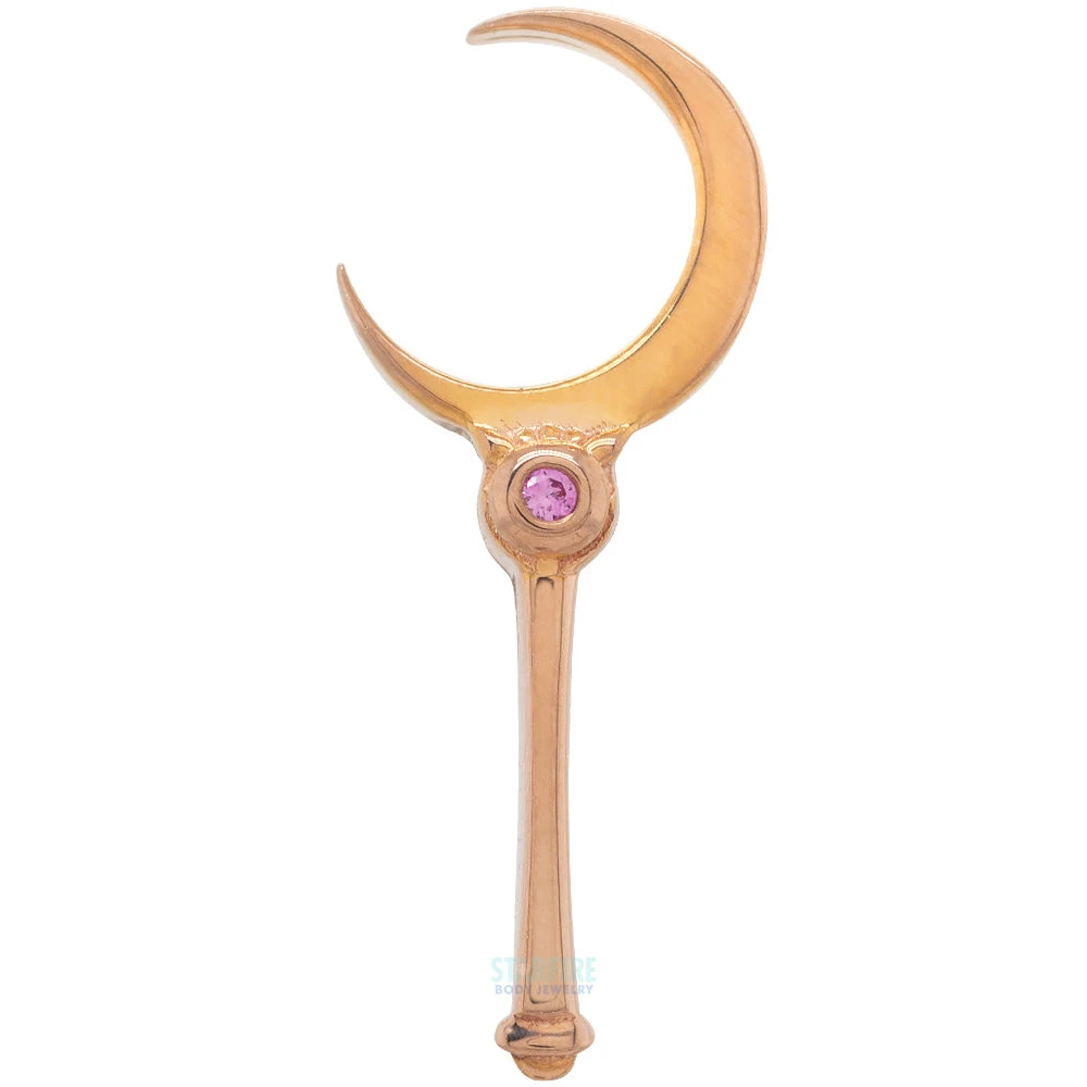 “In the name of the moon, I’ll punish you!” Inspired by the one named Sailor Moon, this two tone crescent moon wand features a dazzling light pink sapphire.