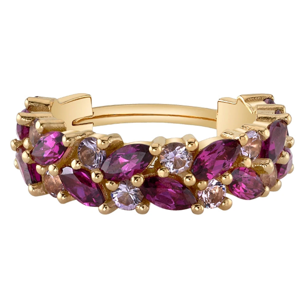 Behold the mesmerizing beauty of Isabella, a stunning hinge ring with two rows of marquise Rhodolite and round Light Amethyst that will leave you breathless.