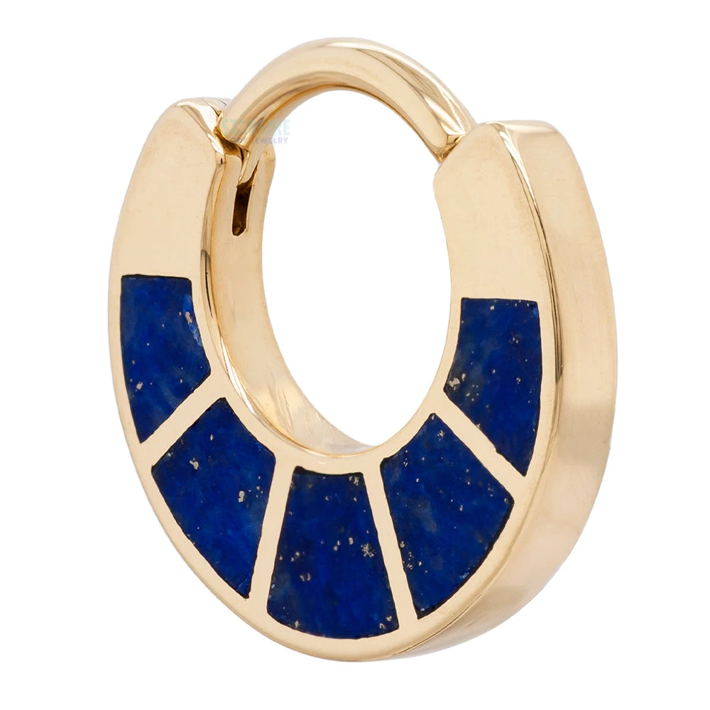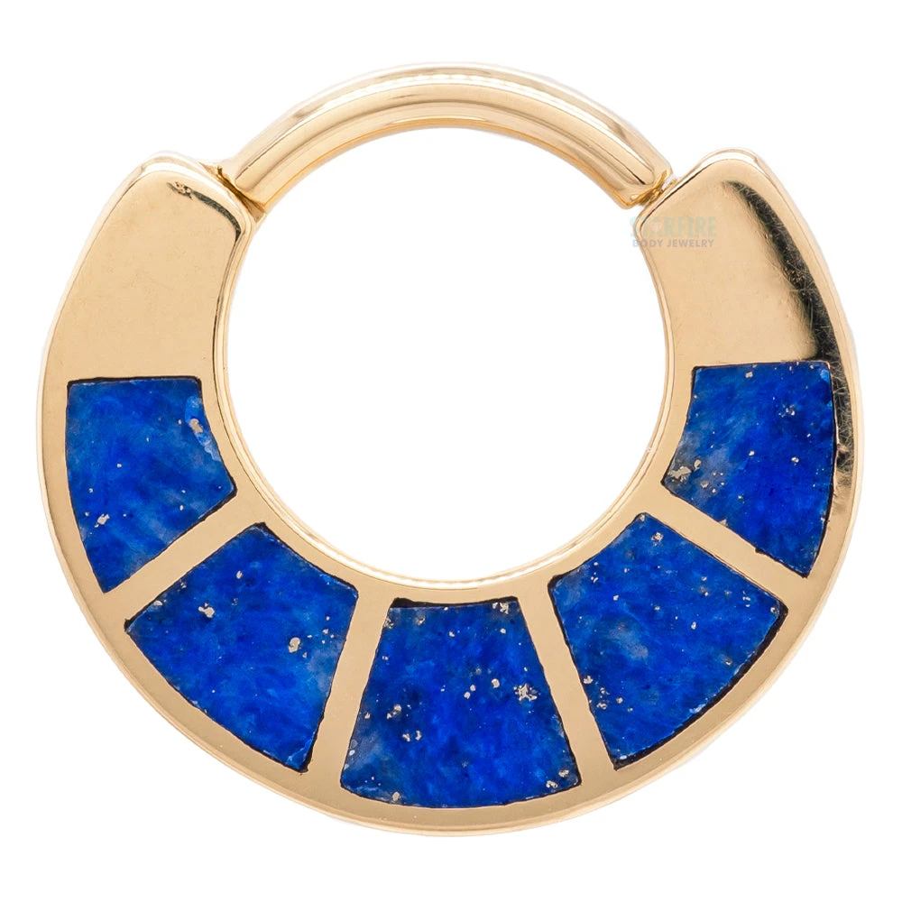 The Islay hinge ring features graduated, inlayed gemstones that showcase a stunning deep blue coloration with a sparkle.