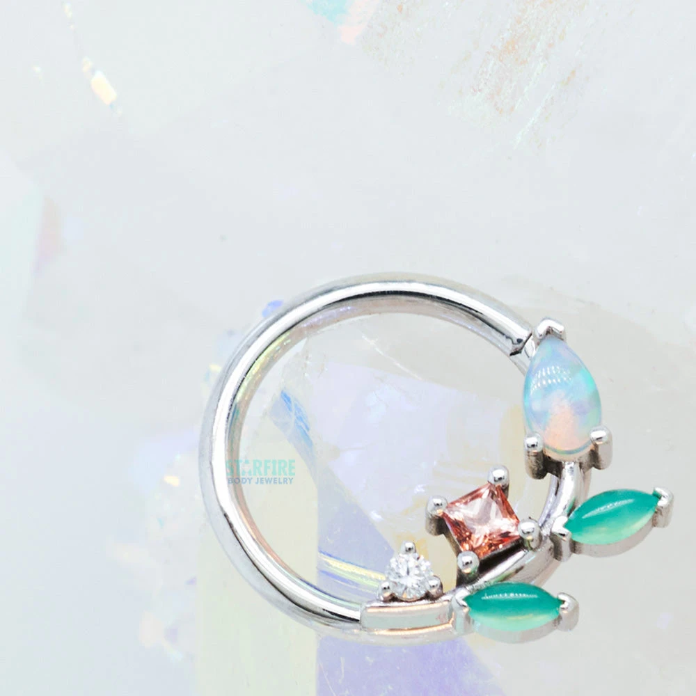 - 12.5mm x 5mm fixed vine on top of ring with (1) 1.5mm Round Genuine White Diamond in Prong’s & (2) 3mm x 1.5mm Marquise-Cut Chrysoprase Cabochon in Prong’s, (1) 2mm Princess-Cut Peach Topaz AA in Prong’s & (1) 4mm x 2.5mm Genuine White Opal AA in Prong’s