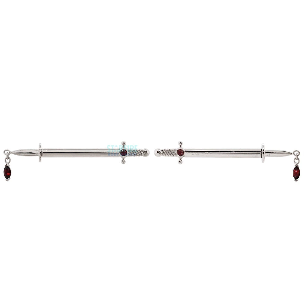 Let the “Kiss of Death” be your jewelry weapon of choice. The hilt is accented with a single red gemstone, alongside a dripping red marquise gemstone at the end of the sword.