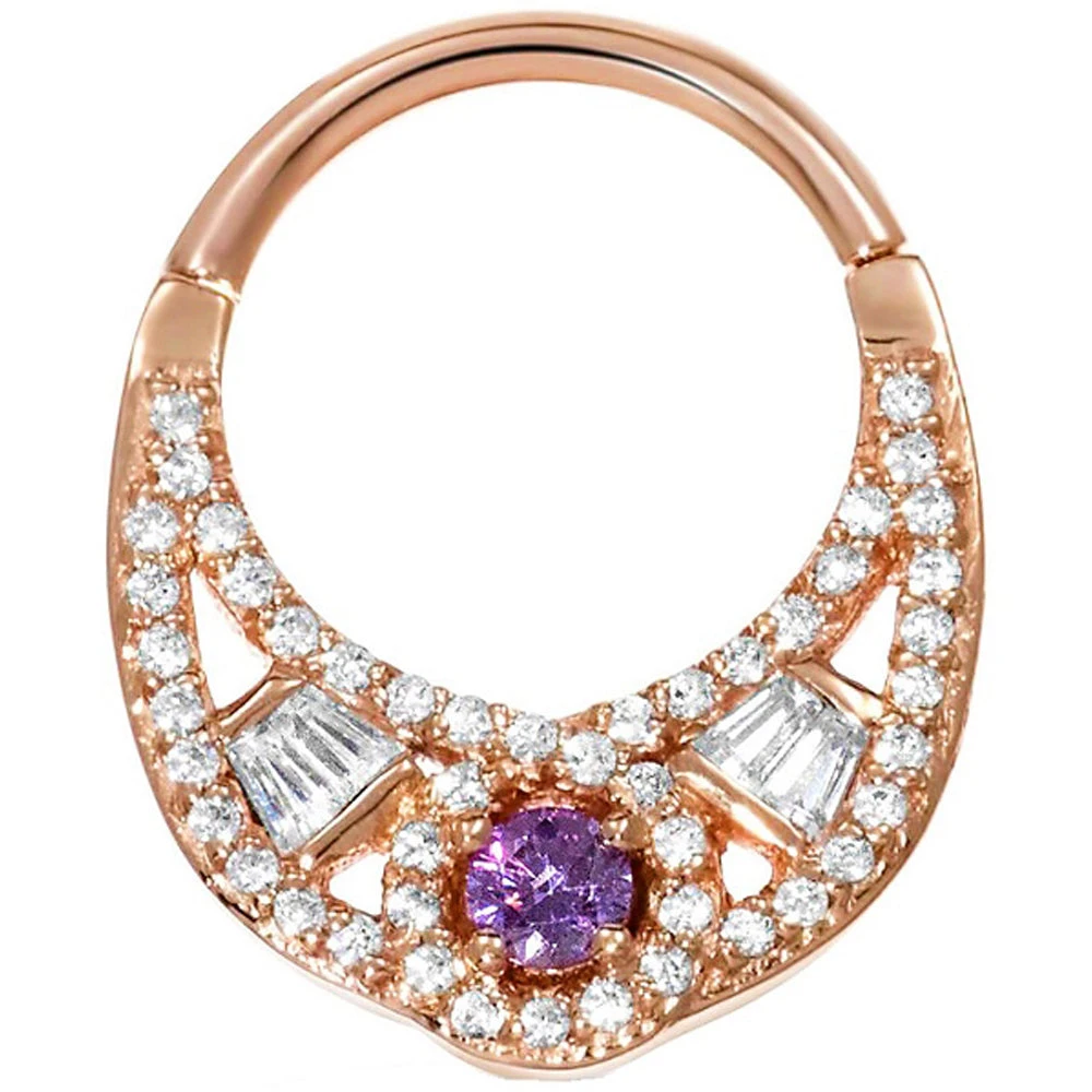 - (1) 2.5mm Round Amethyst AA in center surrounded by (47) 0.8mm Round Genuine White Diamonds in Pave Setting accented by (4) 2mm x 1.25mm x 1mm Tapered Baguette-Cut Genuine White Diamonds in Bezel