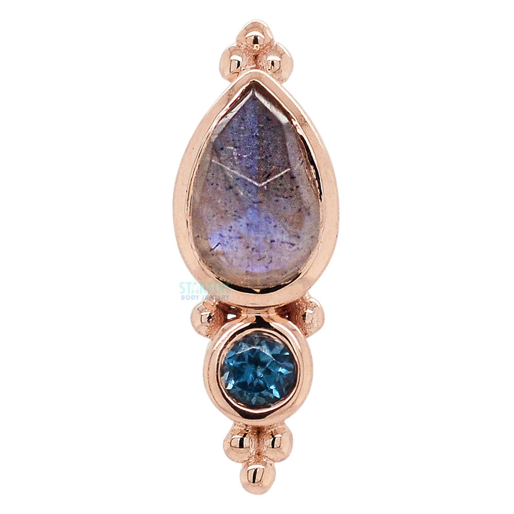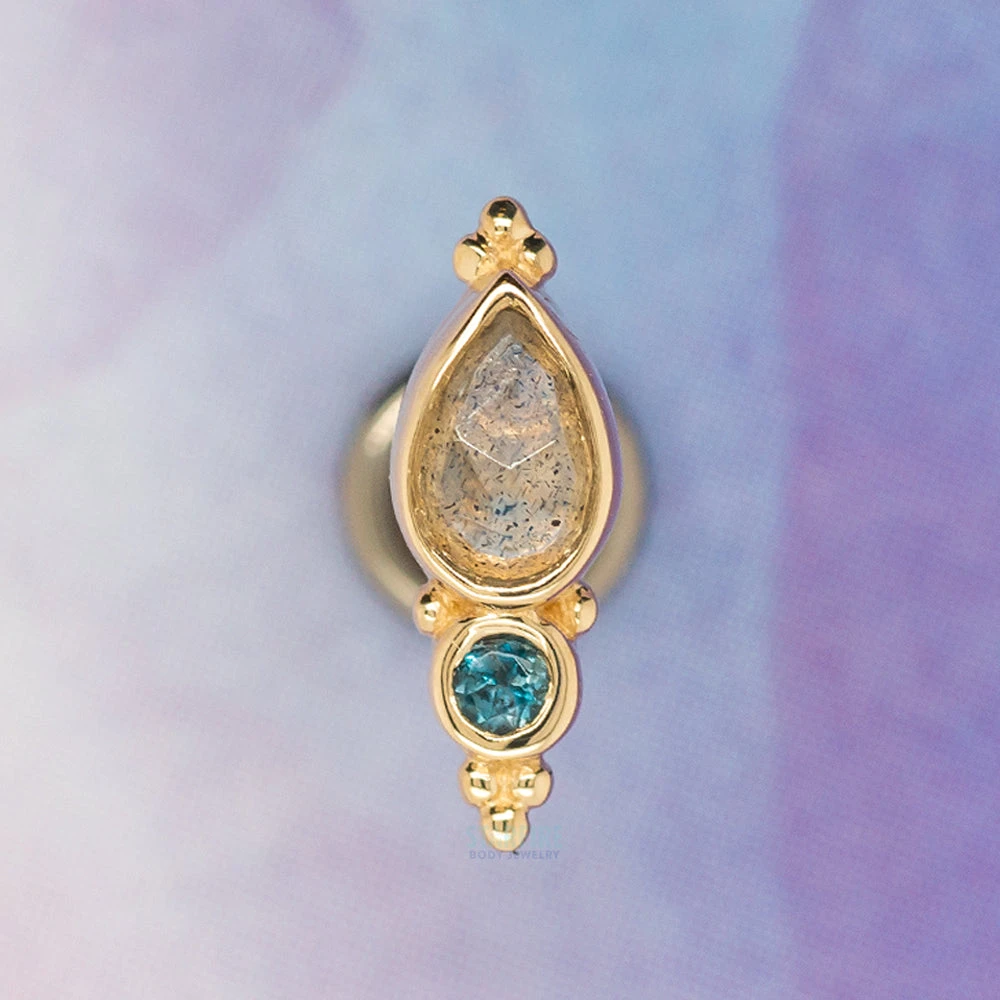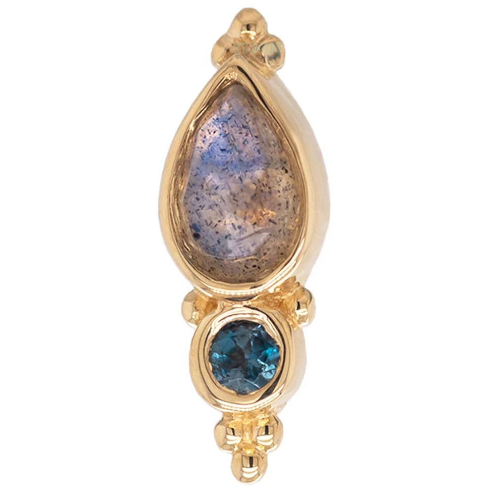 - 9.5mm x 3.5mm threaded end with (1) 4mm x 2.5mm Pear-Cut Rose-Cut Faceted Labradorite & (1) 1.5mm Round Genuine London Blue Topaz AA in Bezel with tiny bead accents