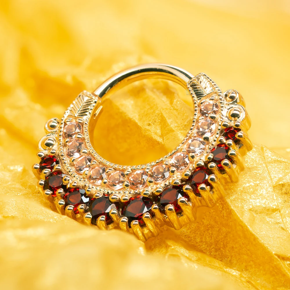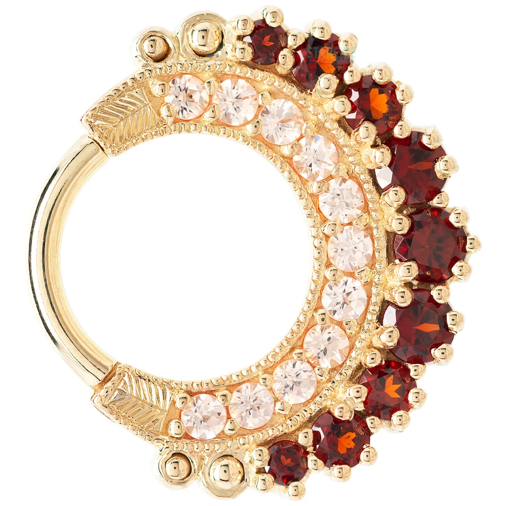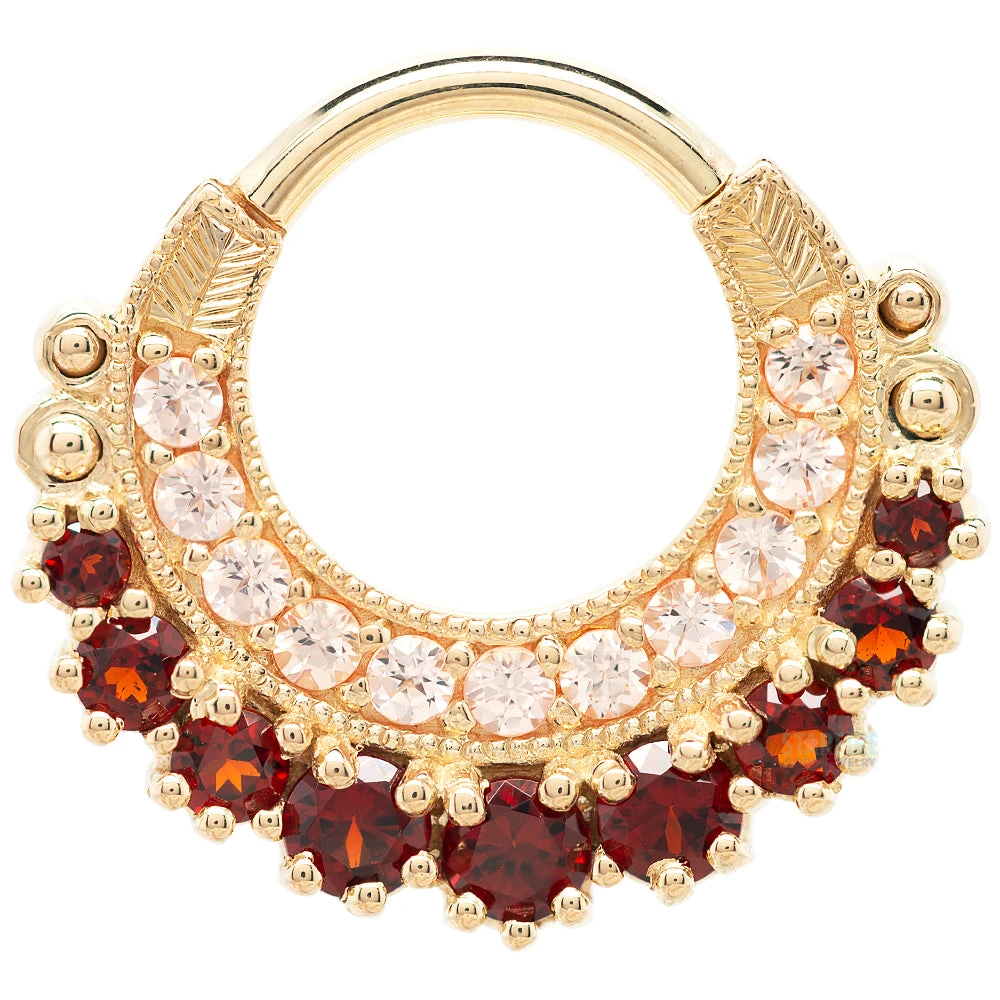 - (3) 2.5mm Round Garnet AA in Prong’s with (4) 2mm Round Garnet AA in Prong’s, (2) 1.5mm Round Garnet AA in Prong’s, (2) 1.25mm Round Gold Bead in Bezel, (2) 1mm Round Gold Bead in Bezel sitting below a row of (11) 1.5mm Round Chatham Lab Created Champagne Sapphires in Prongs and bead accents