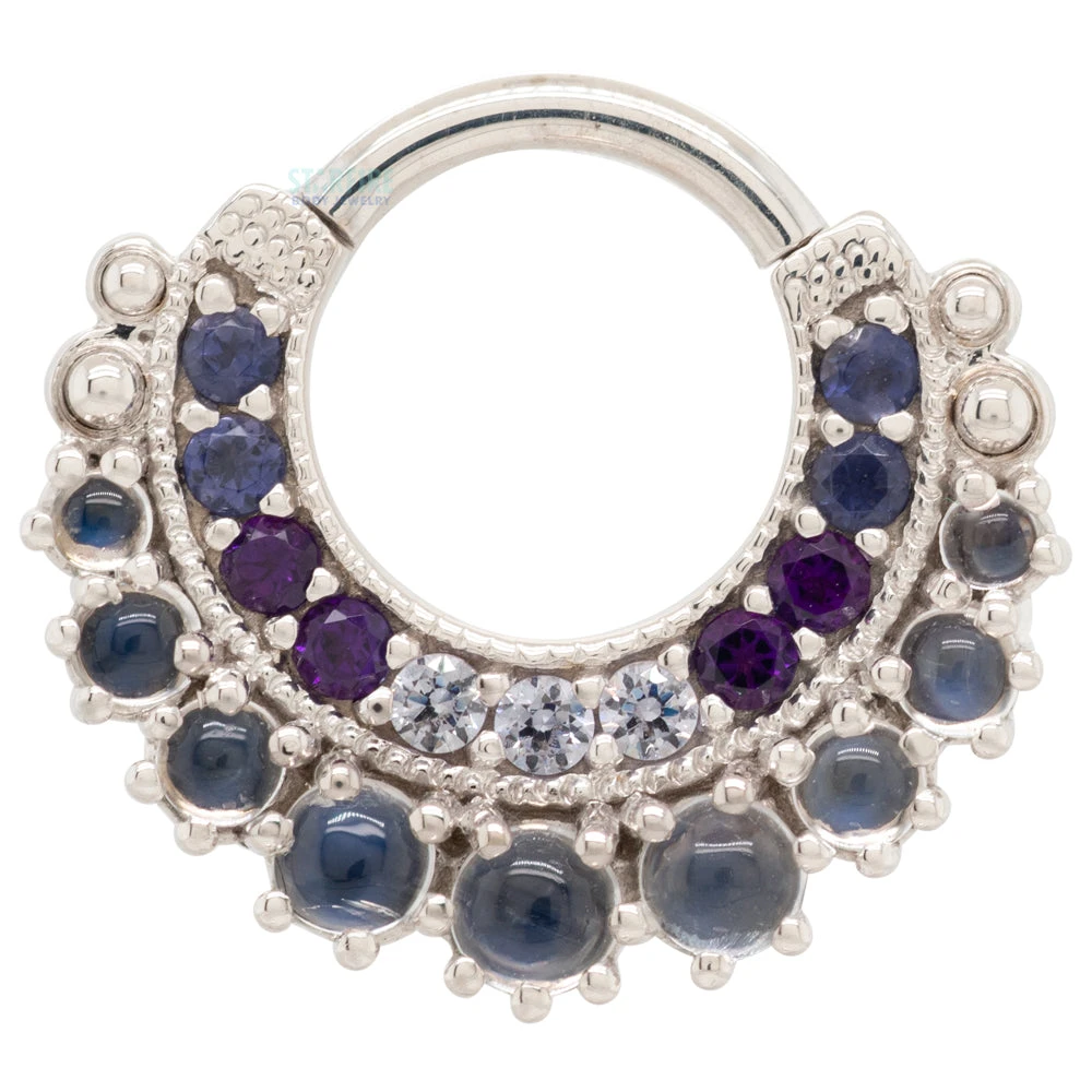There’s no stopping this sparkle-fest! The Marilyn is the epitome of Hollywood glam, featuring a row of glorious Rainbow Moonstones outshone only by an inner row of milgrain-set gems, delicately-beaded accents, and stunning pave detailing.