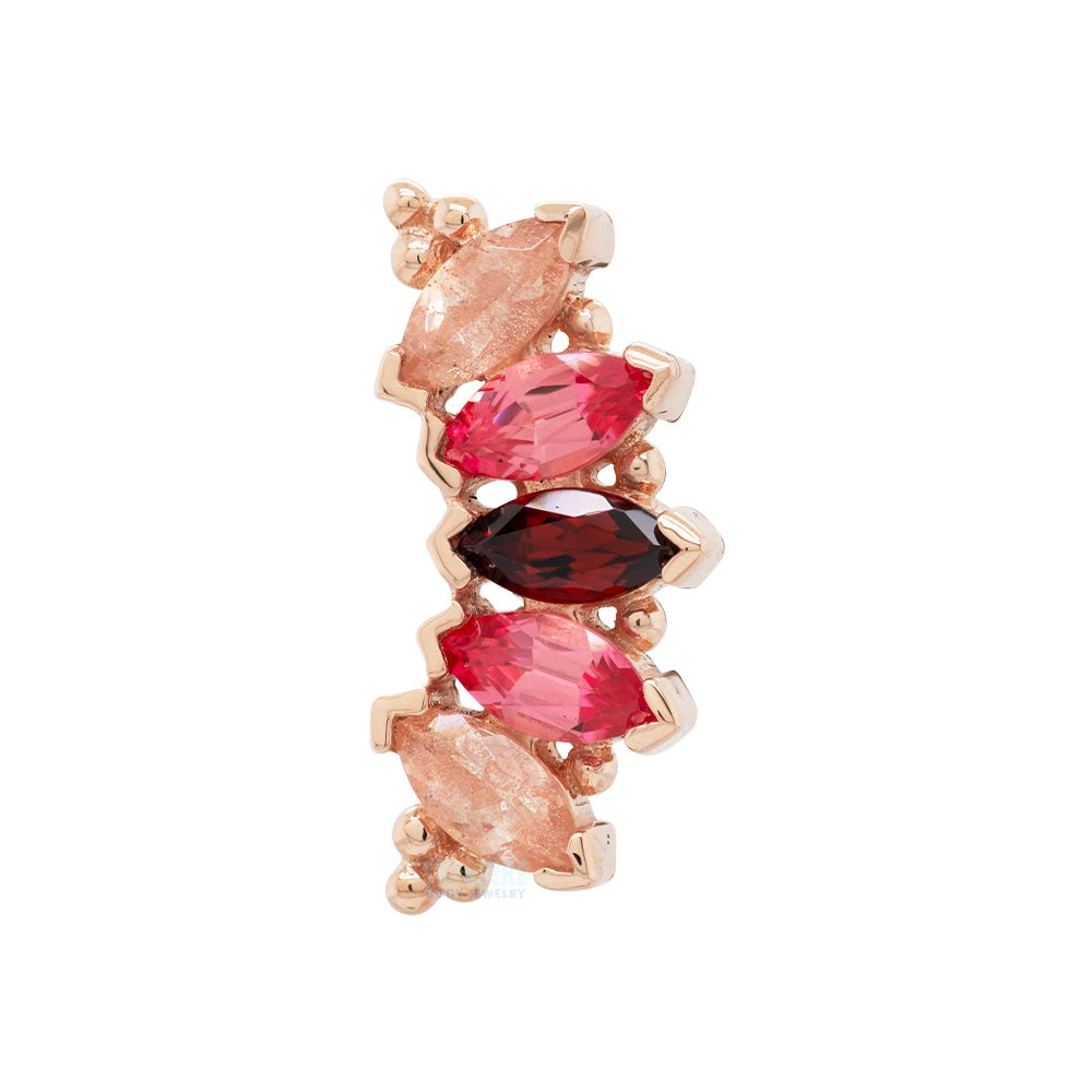 - Medium: 12.5mm cluster threaded end with (1) 4mm x 2mm Marquise-Cut Garnet AA in Prongs surrounded by (2) 4mm x 2mm Marquise-Cut Padparadscha Sapphires in Prongs & (2) 4mm x 2mm Marquise-Cut Oregon Sunstone in Prongs with tiny bead accents