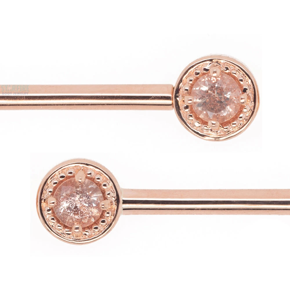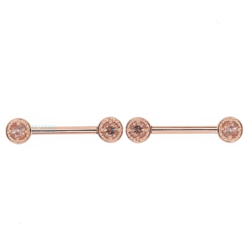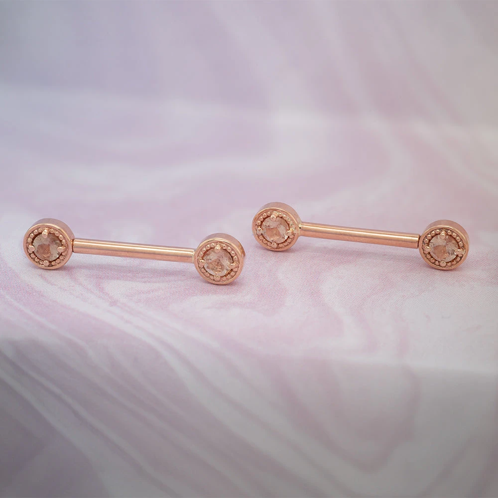 Did you know Oregon Sunstone is said to bring good luck? Not only is the coppery shimmer striking, but the milgrain beadwork takes your nipple jewelry beyond just your basic bezel setting.