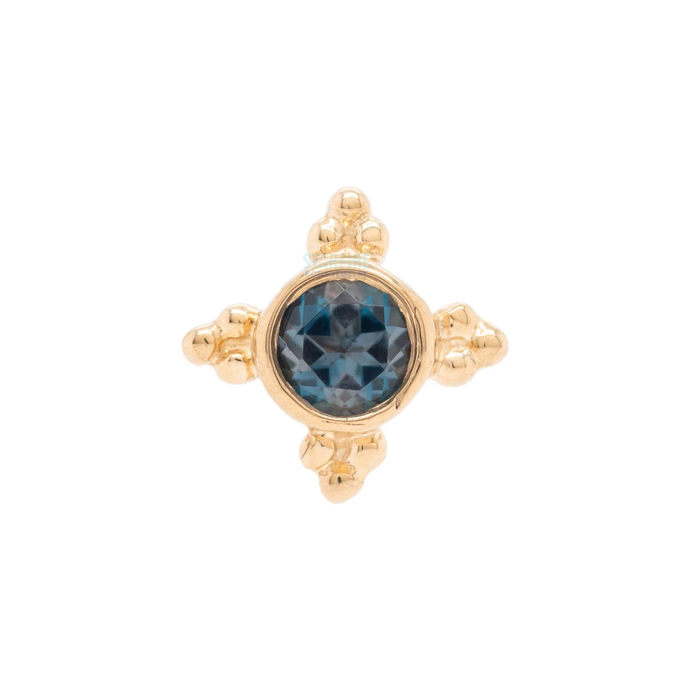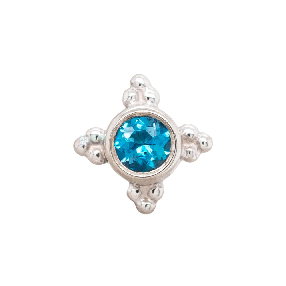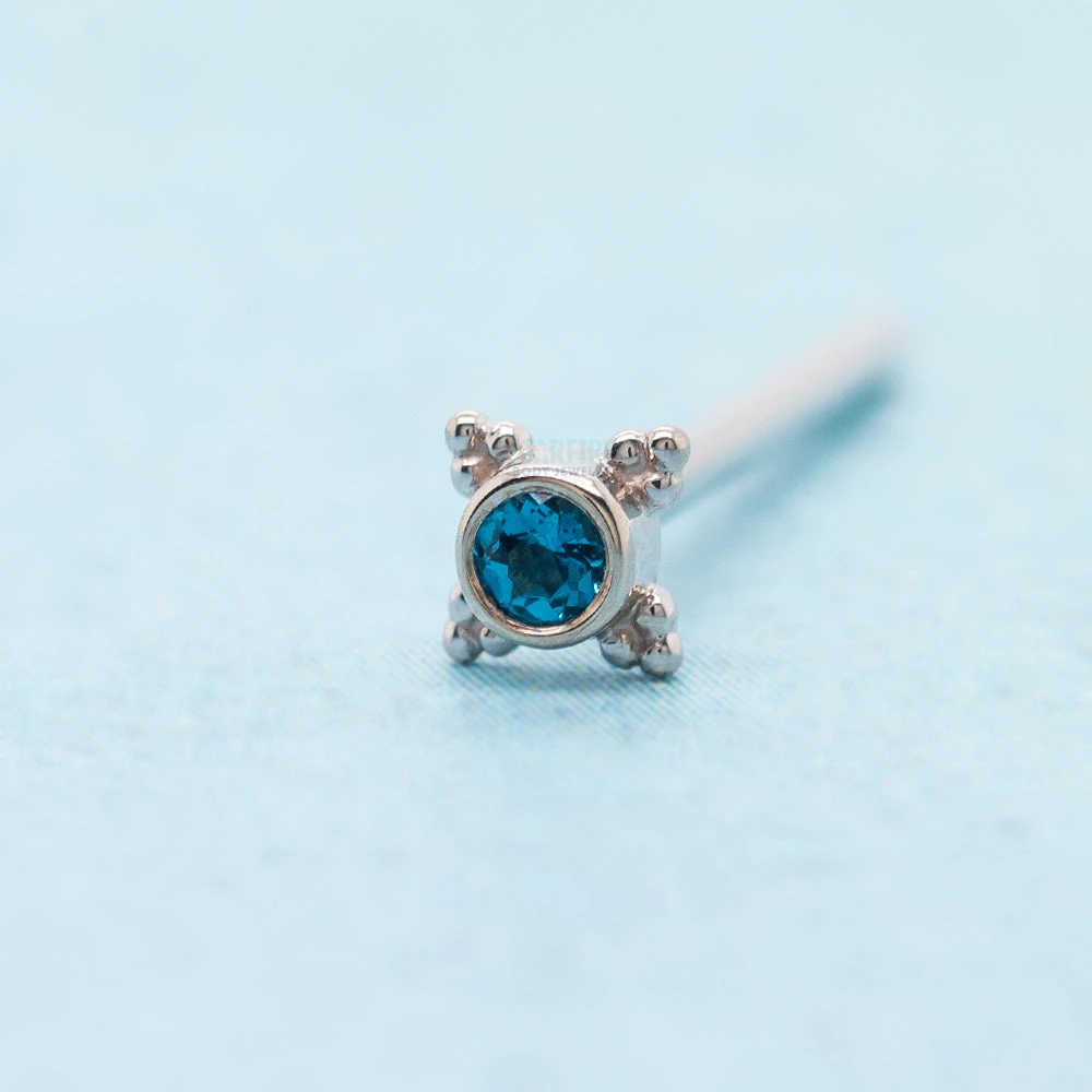 The “Mini Kandy” nostril screw uses groups of tiny bead accents to highlight a single London Blue Topaz.