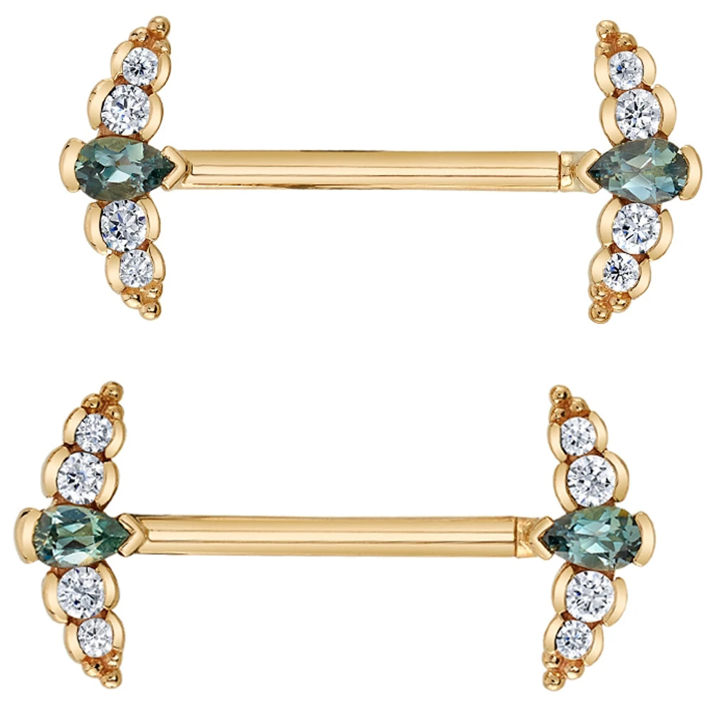 These stunningly unique nipple barbells feature beautiful clusters of captivating grey sapphire and genuine white diamonds.