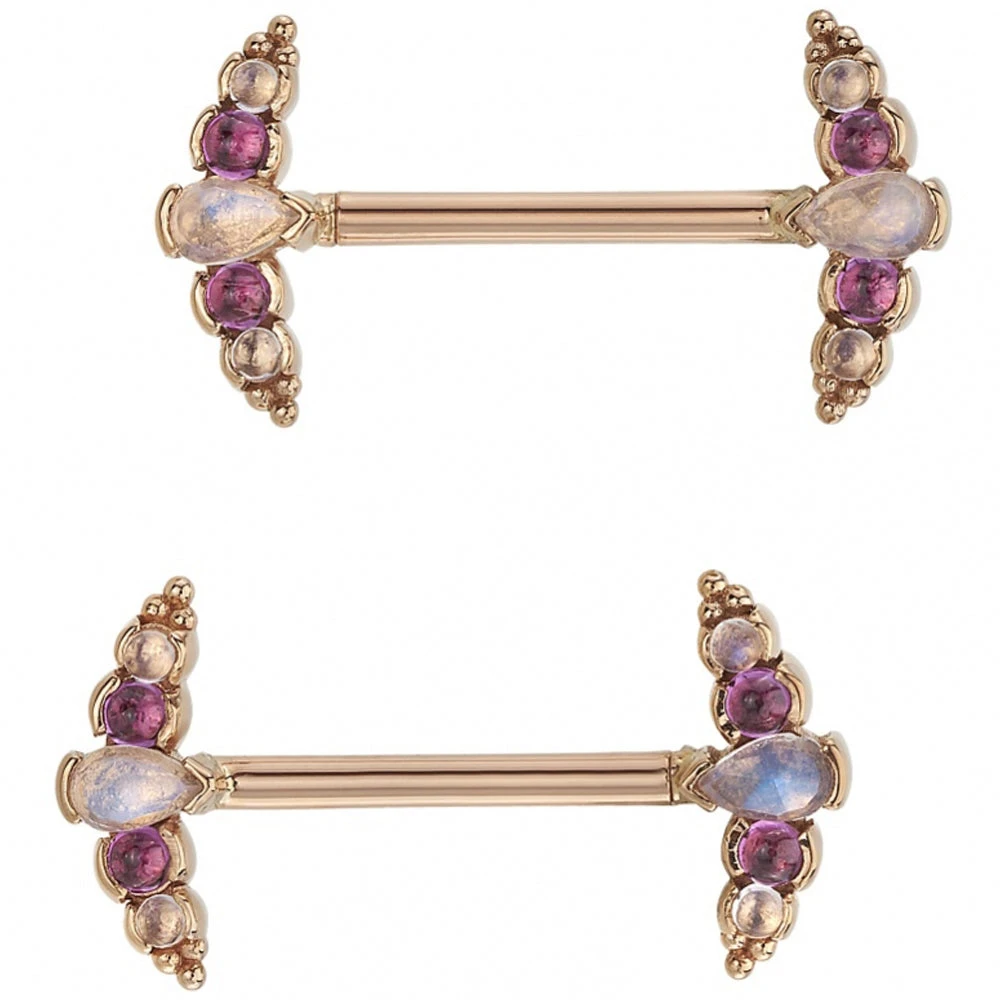 These stunningly unique nipple barbells feature beautiful clusters of captivating rainbow moonstone and rhodolite gems.