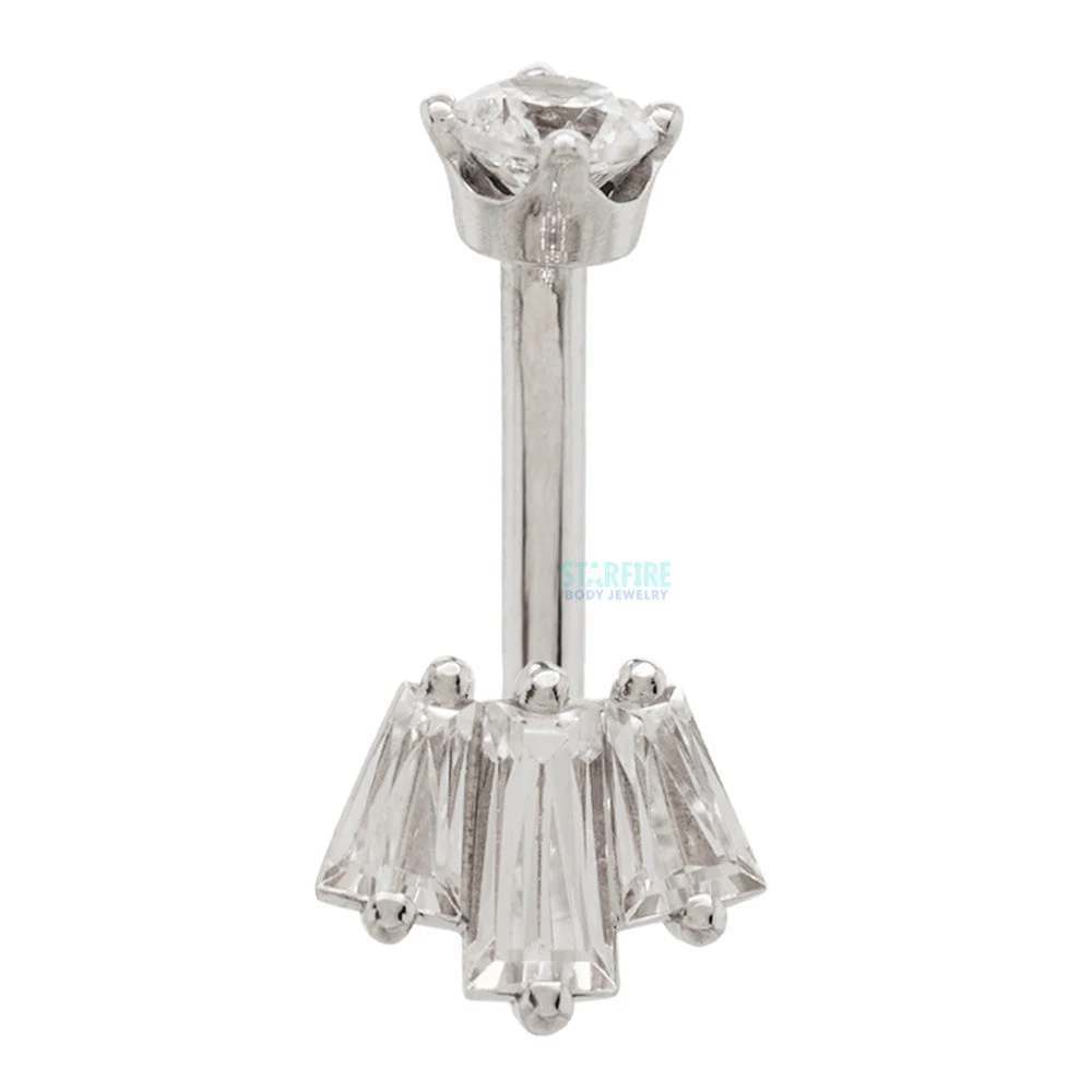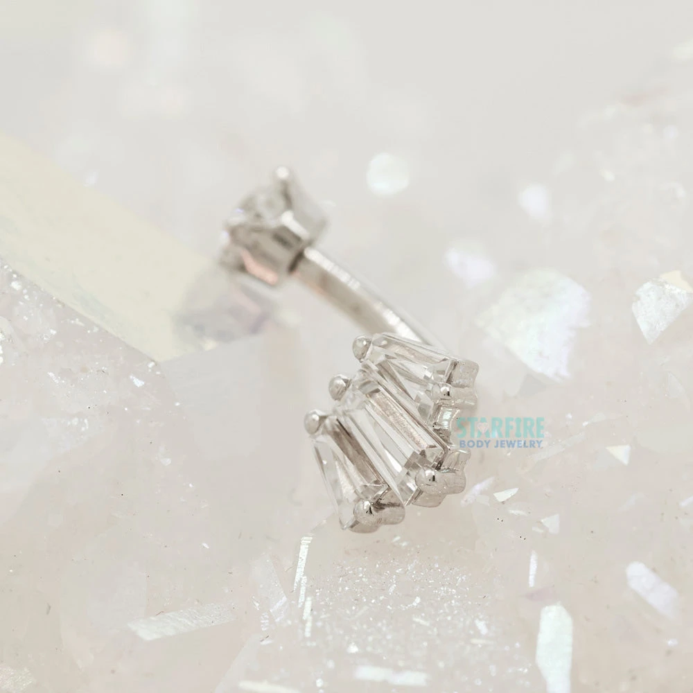 - 6mm x 5mm fixed bottom with (1) 4mm x 2mm x 1.5mm Tapered Baguette-Cut White CZ’s in Prong’s surrounded by (2) 3mm x 2mm x 1mm Tapered Baguette-Cut White CZ’s in Prong’s with (1) 3mm Round White CZ in Prong’s threaded top