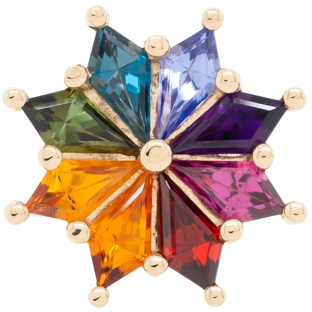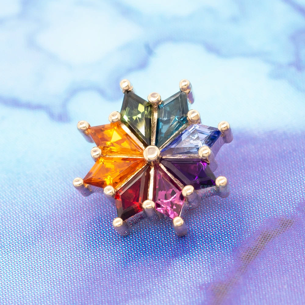 The Pablo is anything but basic. It features a fun, wheelhouse of rainbow pattern gems that starburst kite cut genuine gemstones surrounded by tiny bead accents.