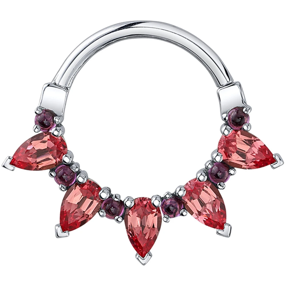 - (5) 4mm x 2.5mm Pear Padparadscha Sapphires in Prongs with alternating (6) 1.5mm Round Rhodolite Cabochons in Prongs