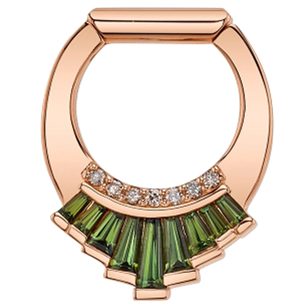 Add the perfect combination of elegance and boldness to your septum piercing. The “Poetiq” features stunning graduating baguette gems in vibrant green tourmaline beneath a row of rich champagne diamonds.