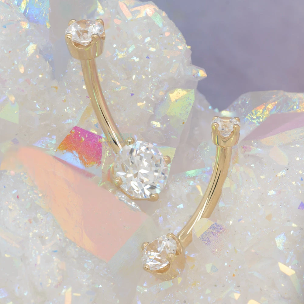 The classic low profile closed back prong setting is always in for golden navel curves.