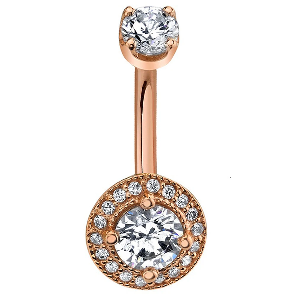 A halo of gems surrounds a large gem in the center, making this one stunningly glamorous navel curve!