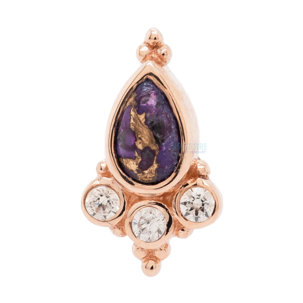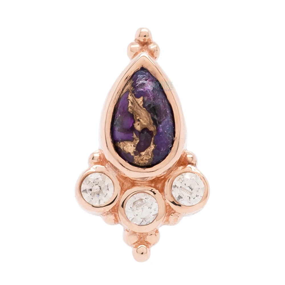 - 11mm x 6.5mm threaded end with (1) 5mm x 3mm Pear-Cut Copper Purple Turquoise above (3) 1.5mm Round Champagne CZ’s in Bezel with tiny bead accents